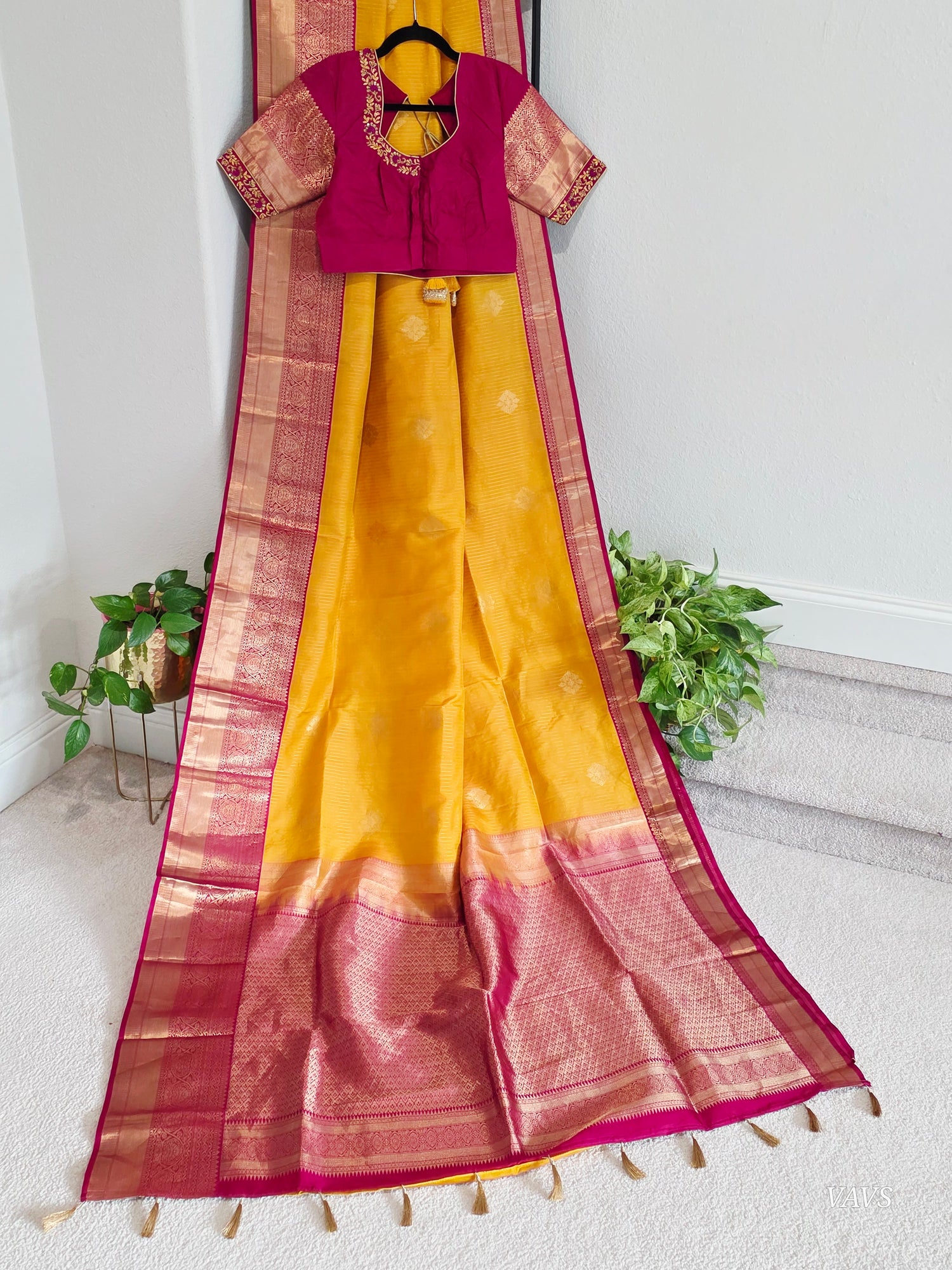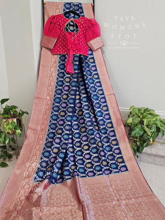 Received the saree and it's very beautiful, the color, texture & shining of the saree is so beautiful more than expected. Blouse also perfectly stitched with lot of allowance to increase the size. Beautiful saree bag is a plus and fast shipping. Thank you Anusha !