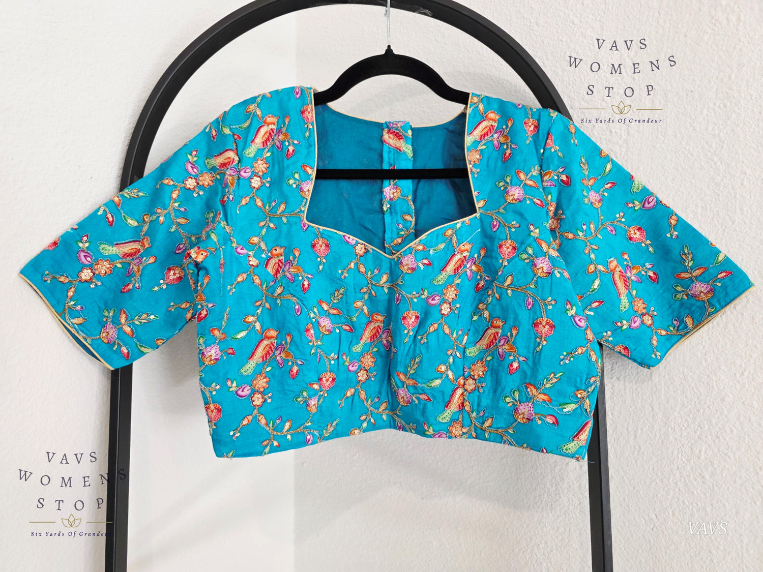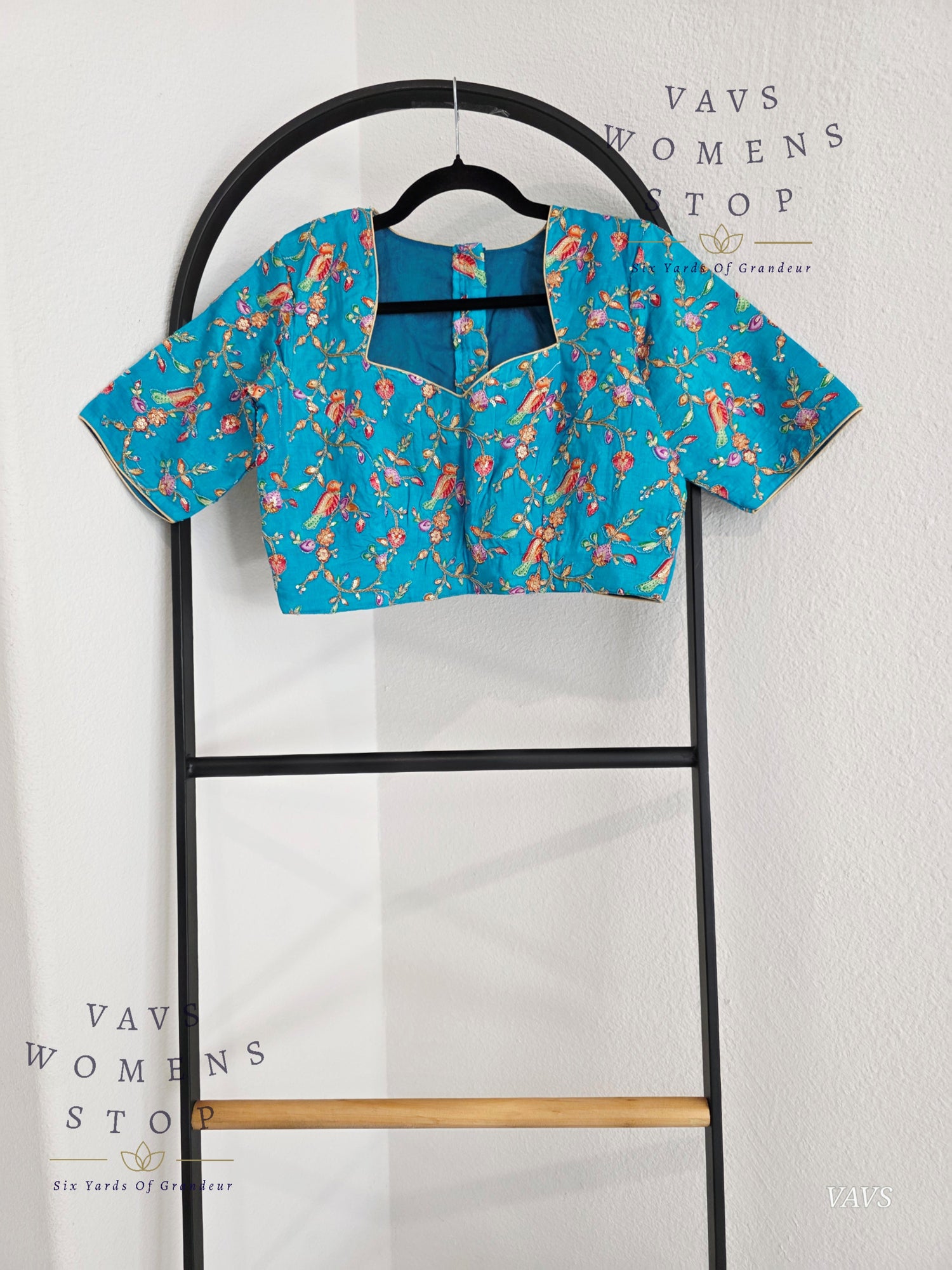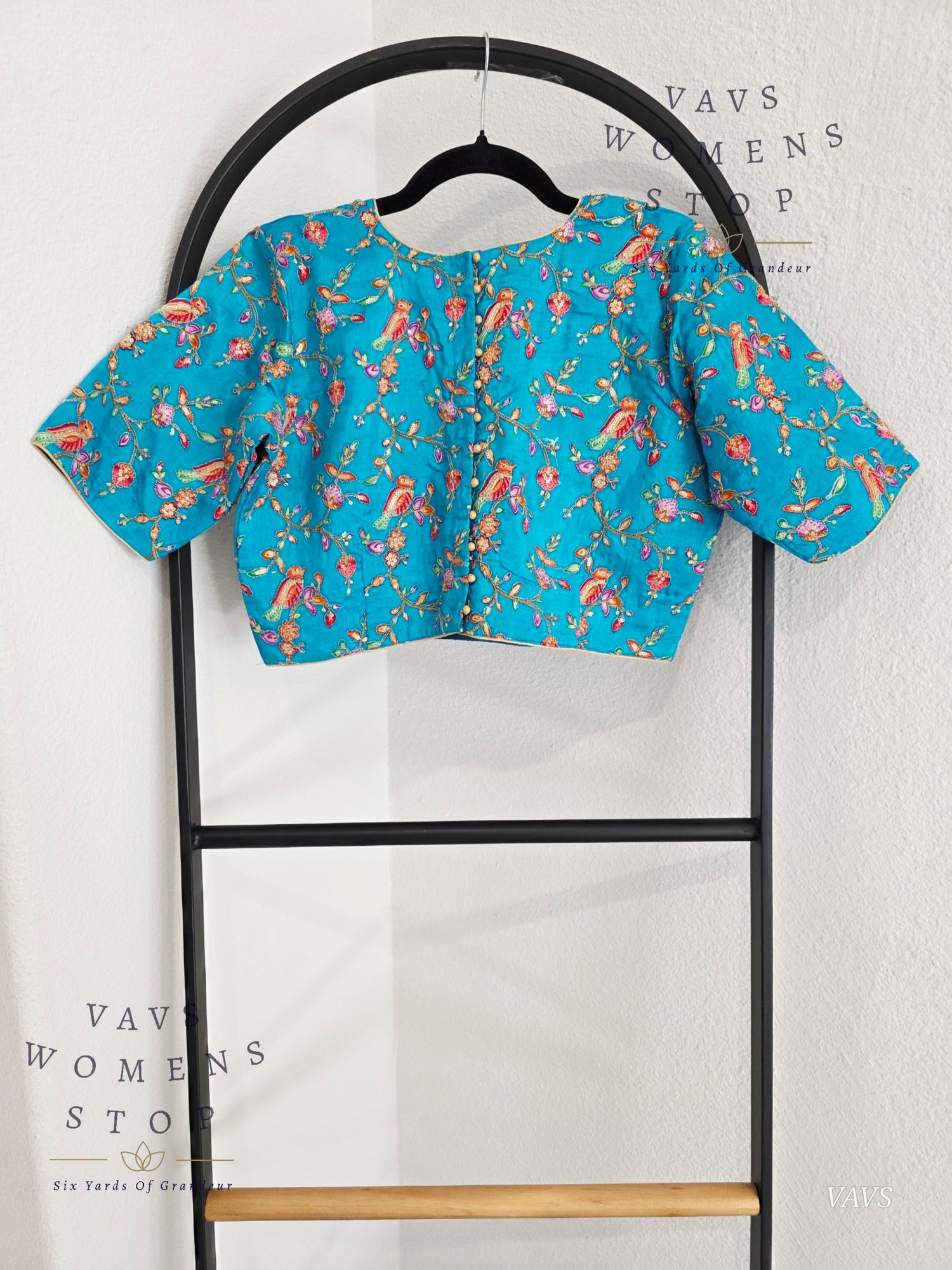 Aqua Blue Shade Birds Print Outline Embroidery Blouse