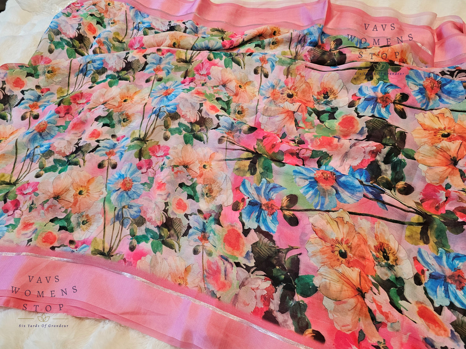Baby Pink Shade Floral Print Soft Georgette Saree – Elegant Party & Festive Wear