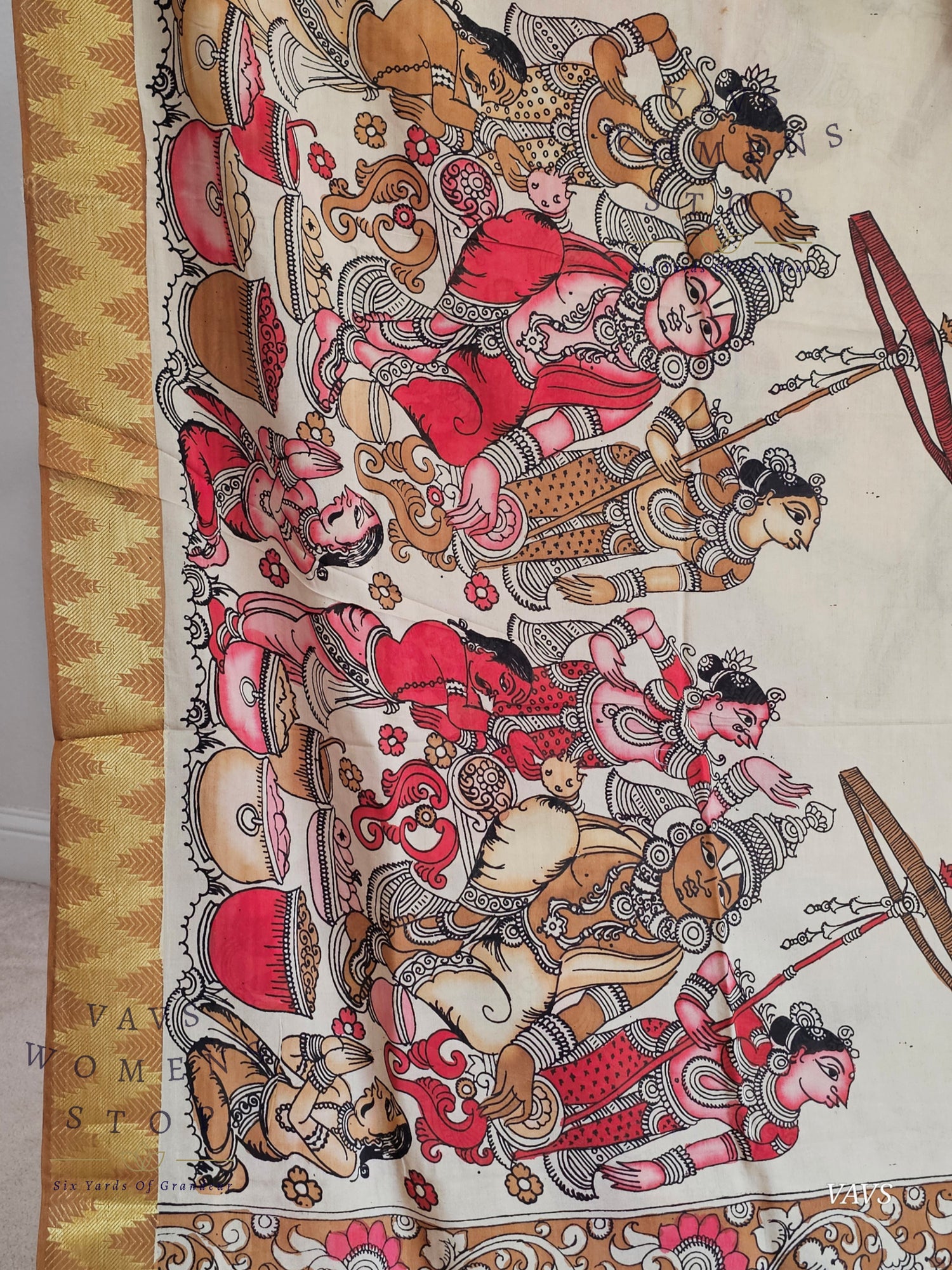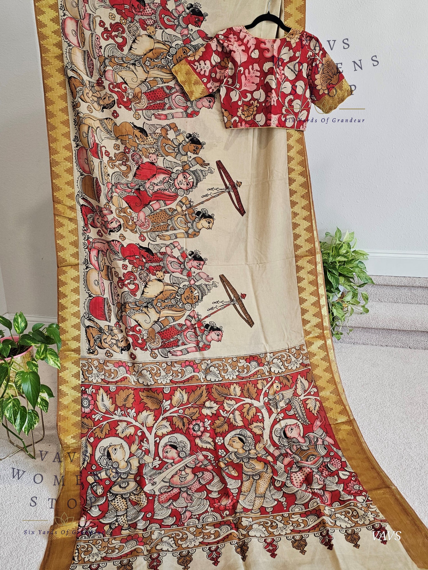 Bangalore Silk Kalamkari Hand-Painted Saree with Zari Border & Stitched Blouse