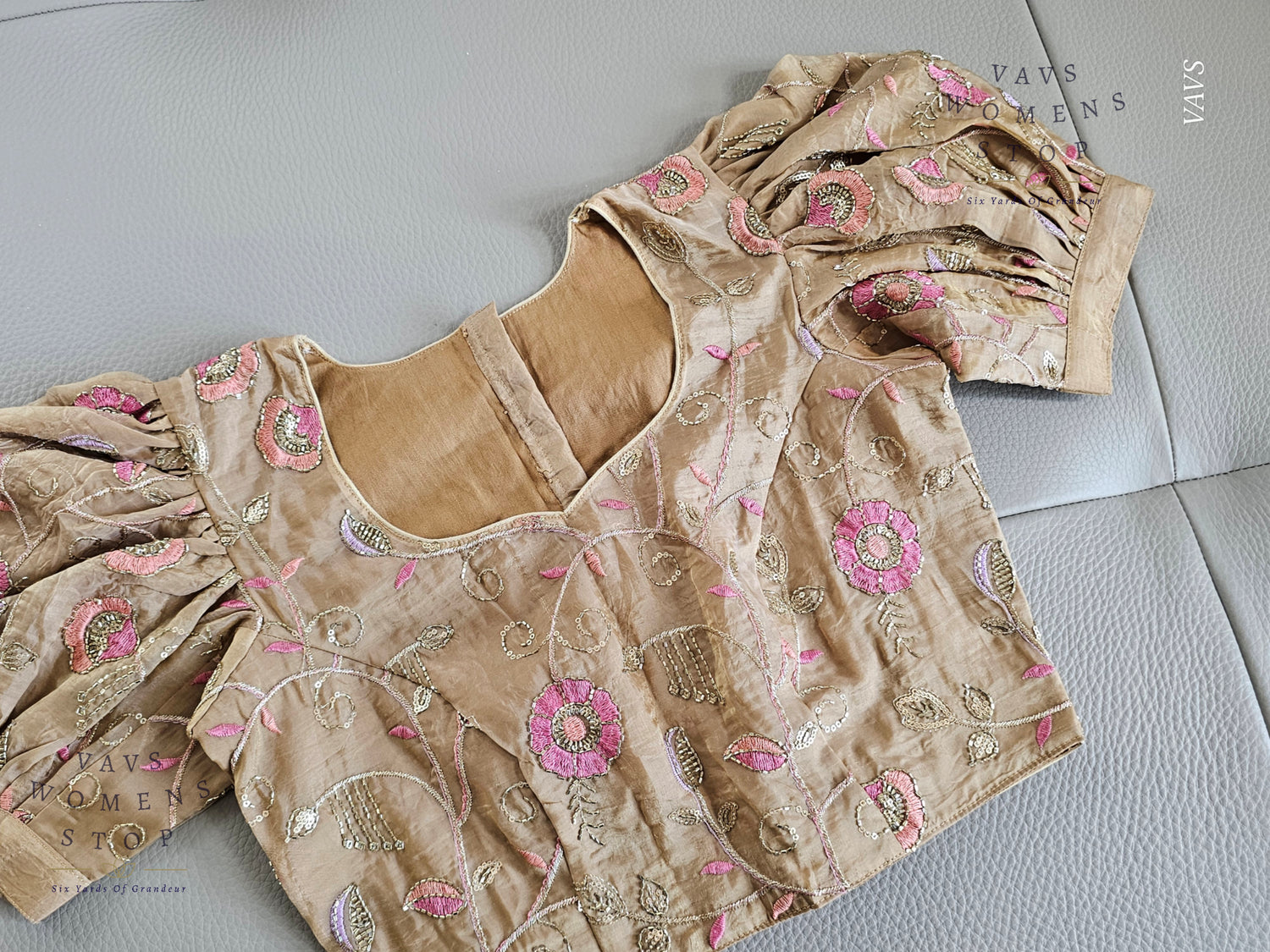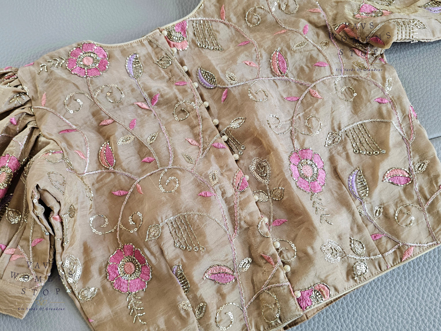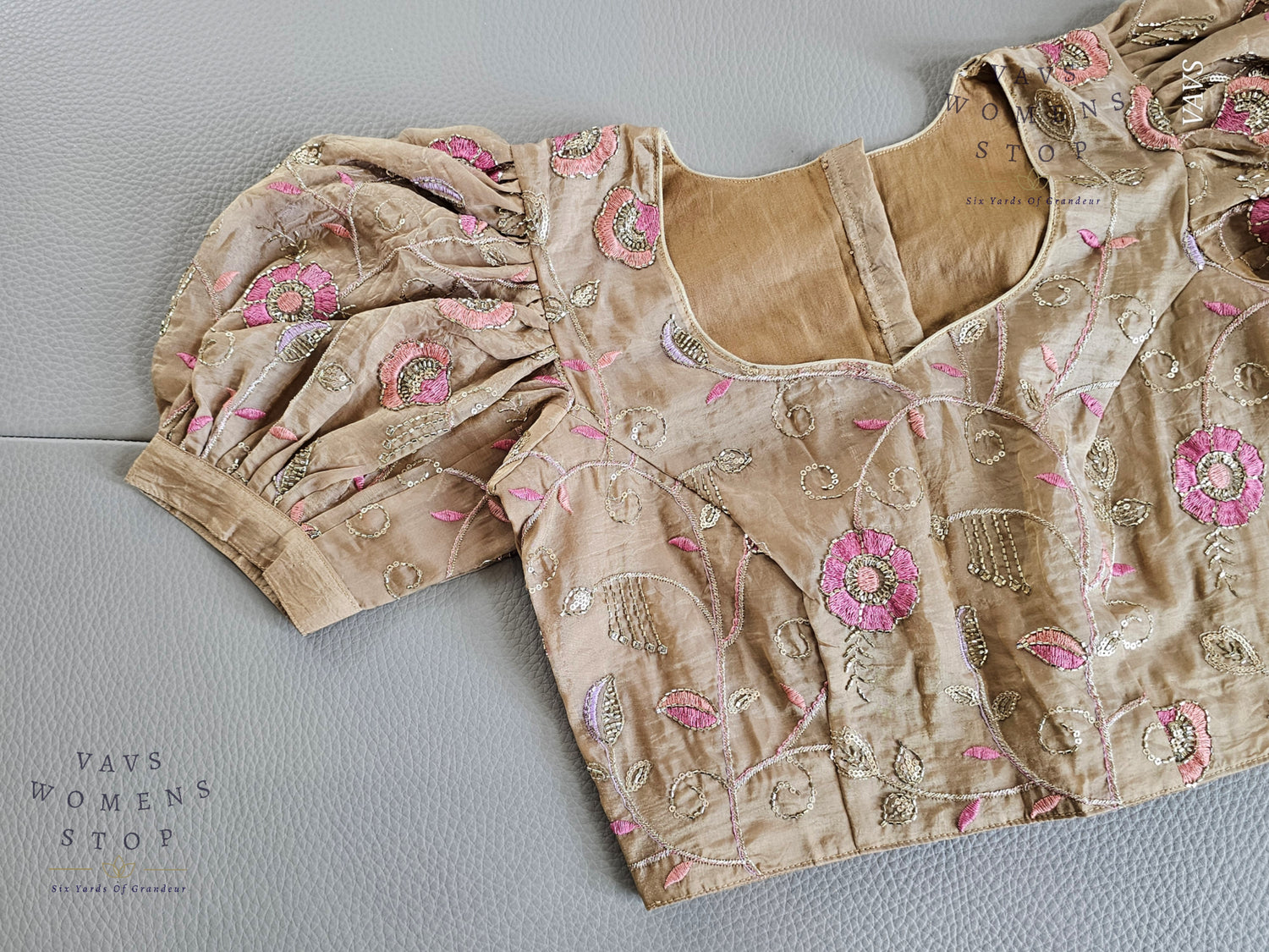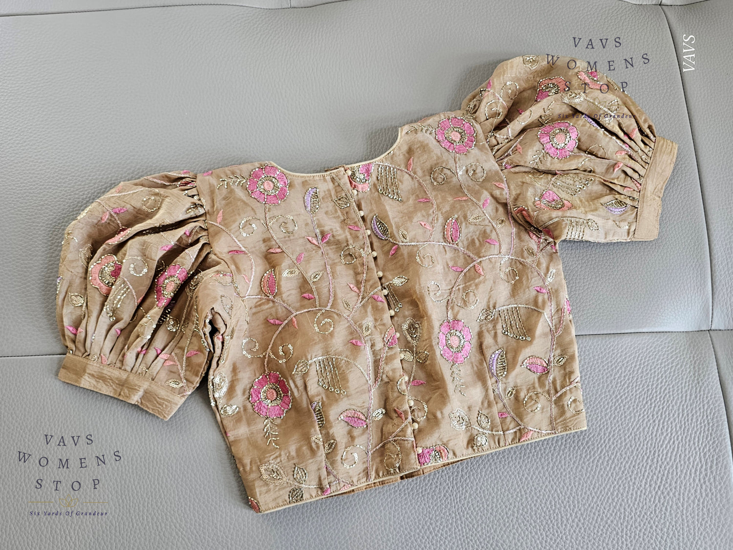 Add a regal touch to your wardrobe with this Beige Shade Crushed Silk Blouse, featuring delicate machine embroidery and trendy puff sleeves. Designed for elegance and comfort, this blouse pairs beautifully with festive silk sarees, bridal ensembles, or traditional outfits.