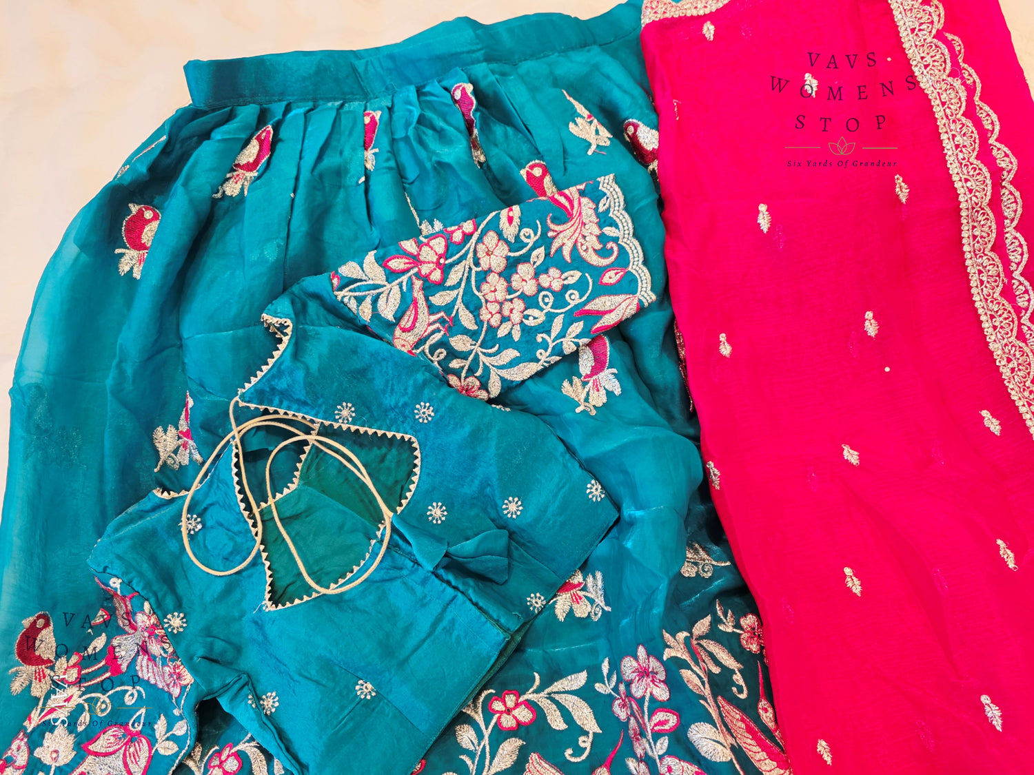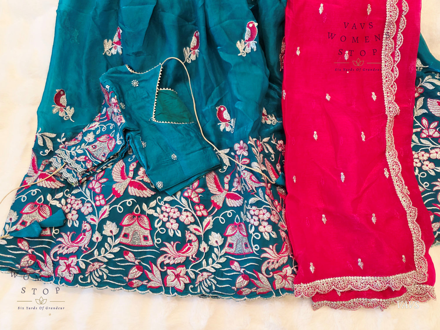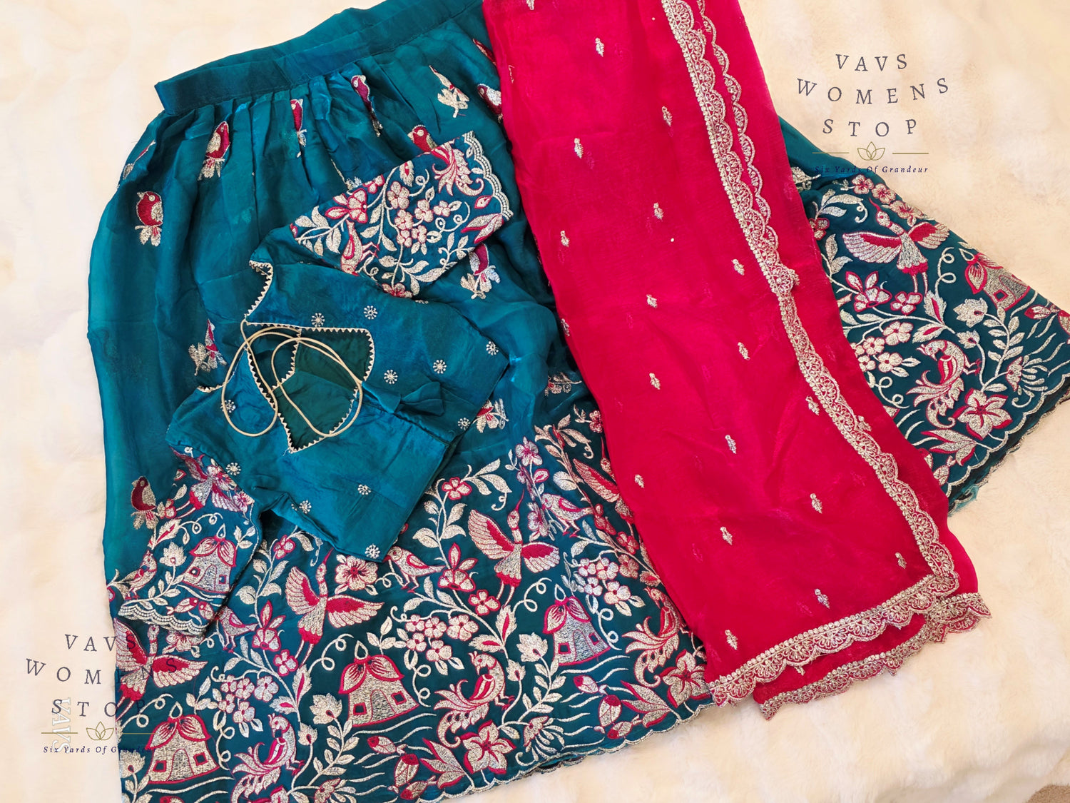 Elegant Designer Space Silk Lehenga Half Saree Set featuring cute birds machine embroidery, combining modern design with traditional charm. Crafted in luxurious Space Silk fabric, this set offers a graceful drape and elegant finish. The lehenga is Can-Can lined for a voluminous and regal look — perfect for festive, party, or wedding occasions. Suitable for Girls Ages 11+ Too. Lehenga color is Teal Green Shade