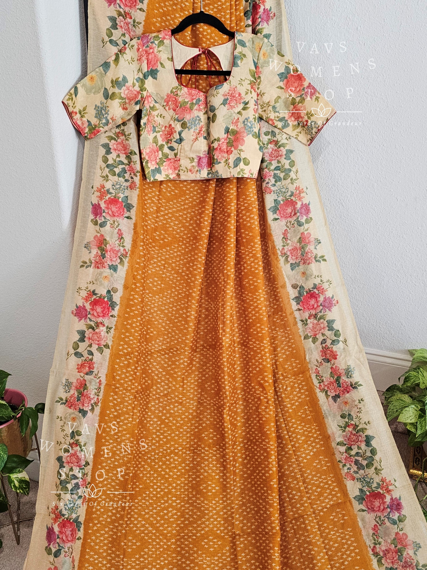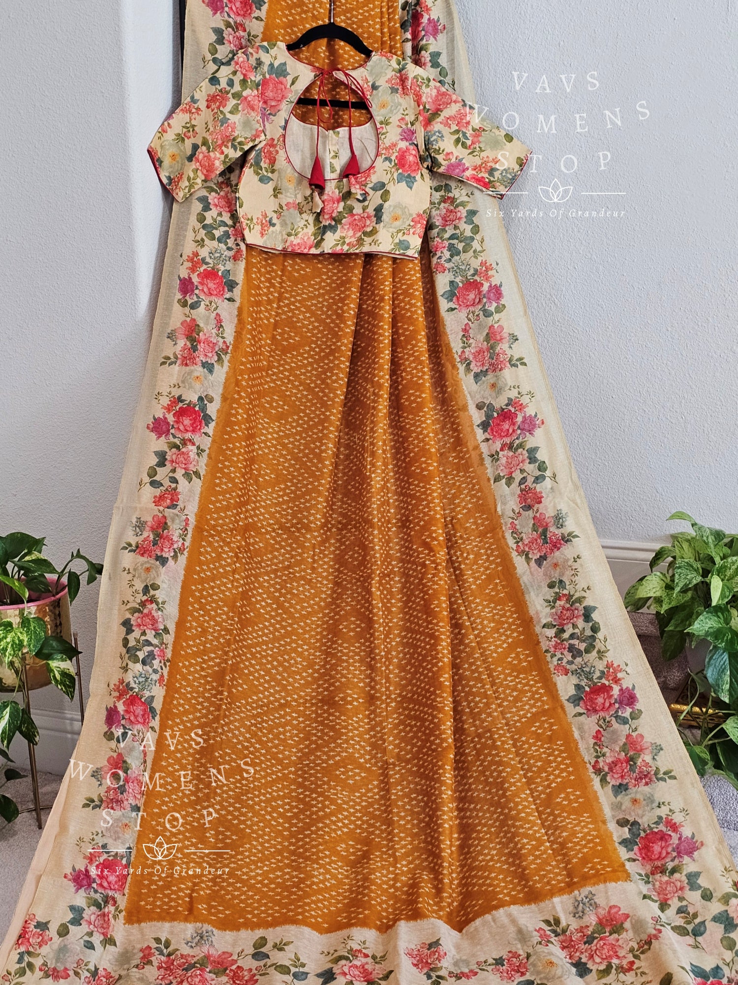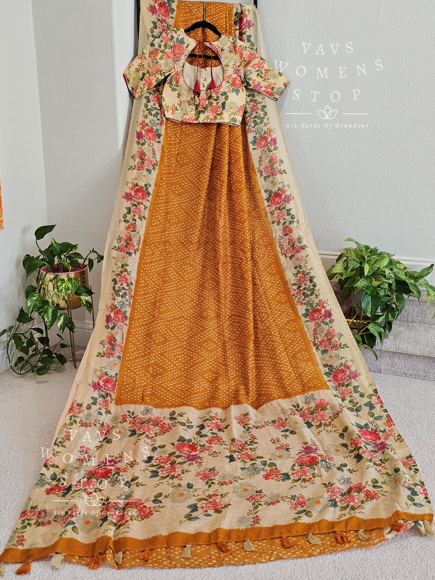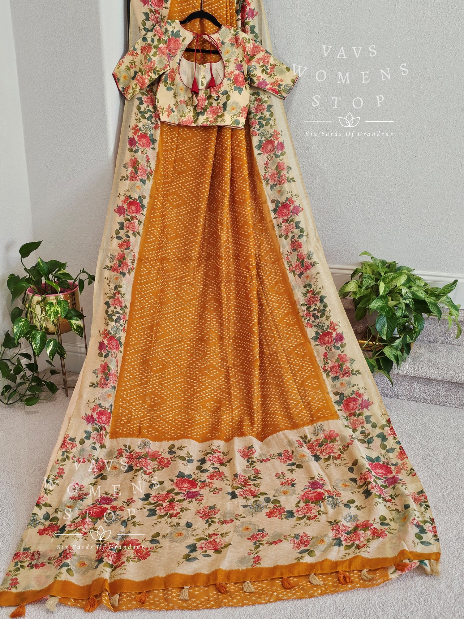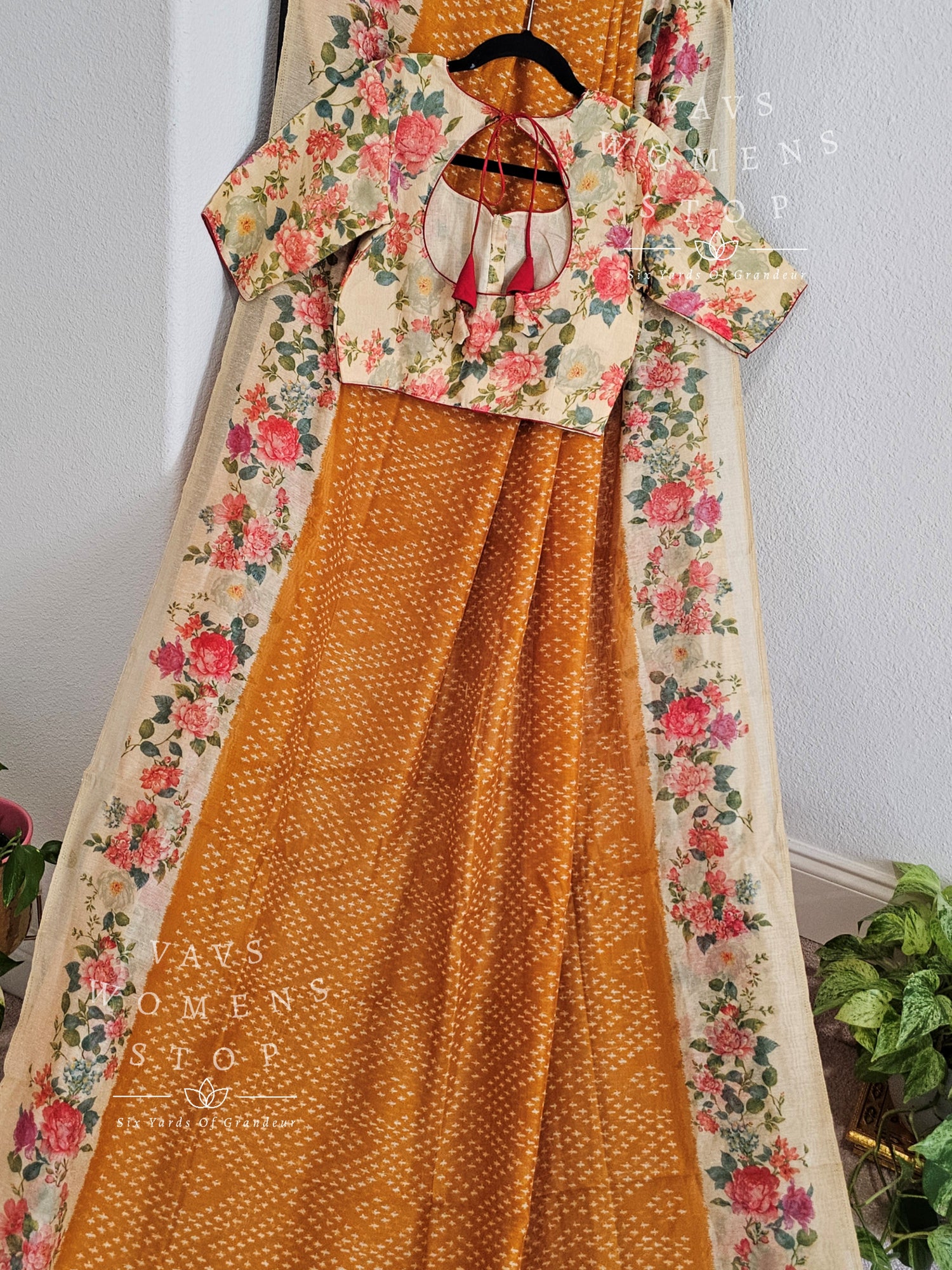 Fusion of floral and bhandini prints on linen cotton saree - blouse