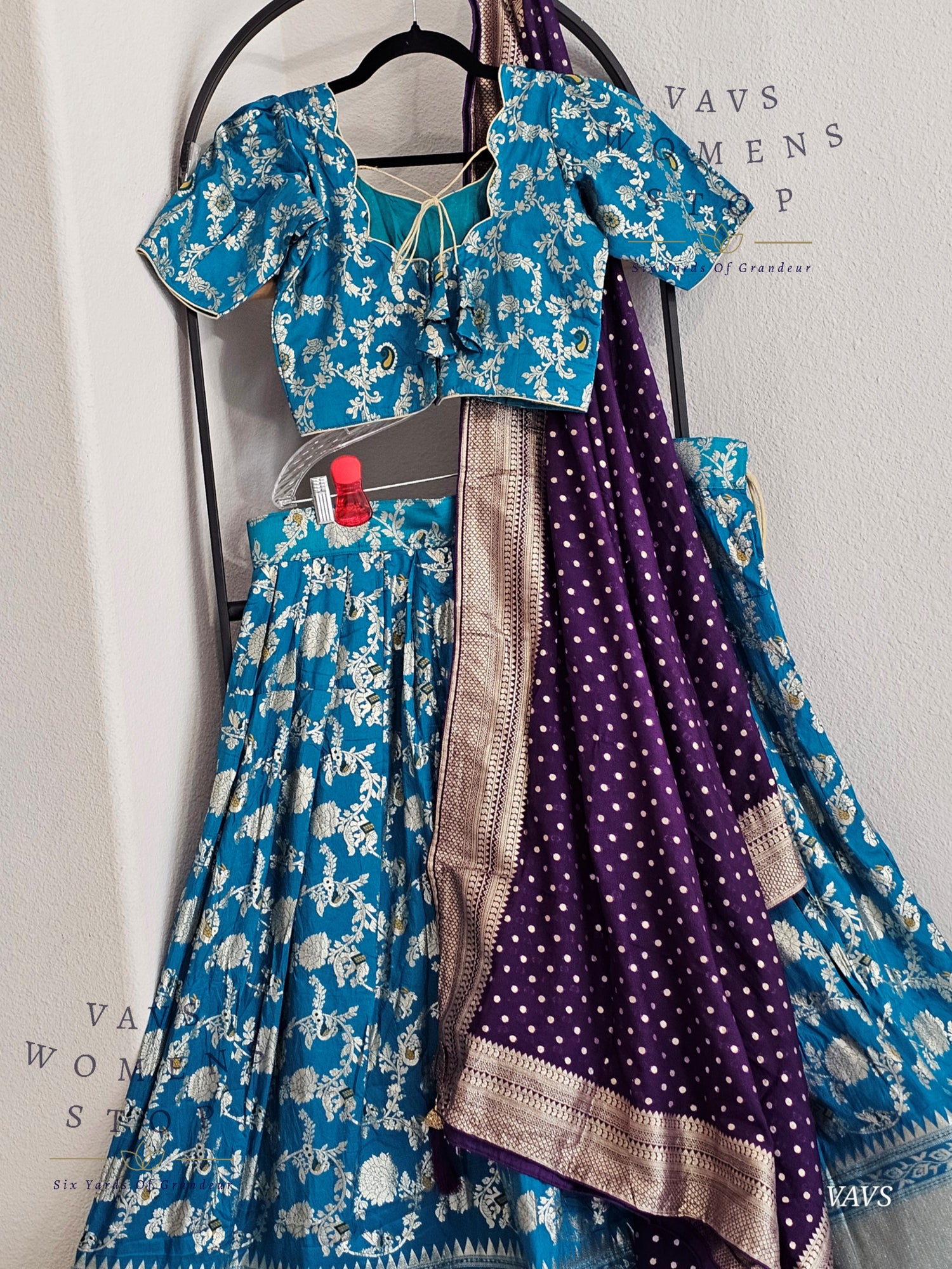Luxurious Munga Benarasi Designer Half Saree Set crafted with rich traditional weaving and elegant drape — perfect for festive, bridal, or party occasions. The half saree is Can-Can lined, adding graceful volume and structure for a stunning silhouette. Comes as a ready-to-wear set with a stitched blouse and matching dupatta. Suitable for Girls Ages 11+ Too