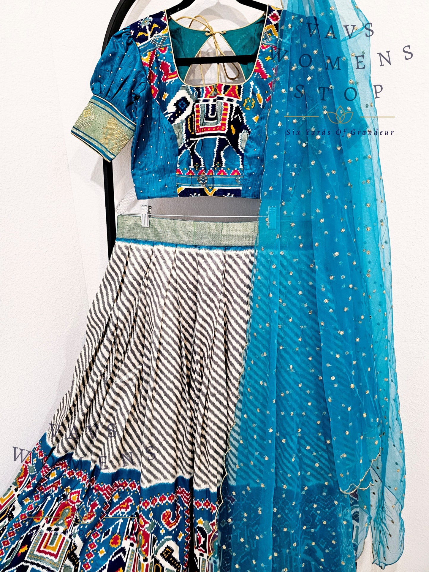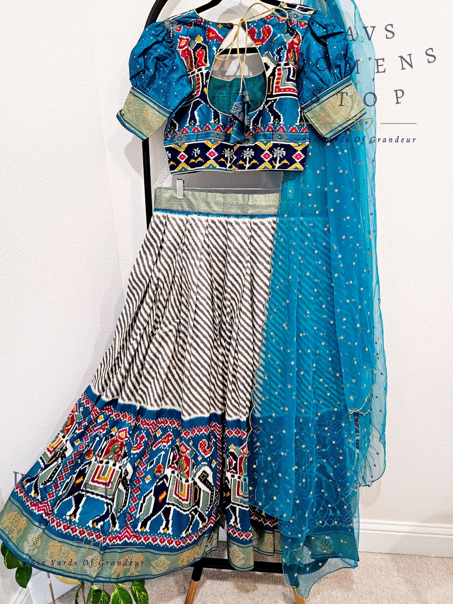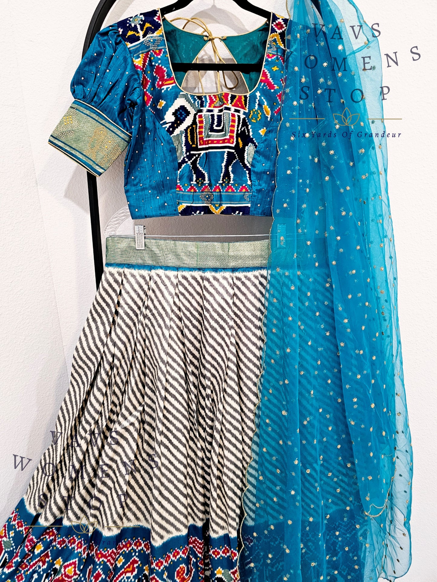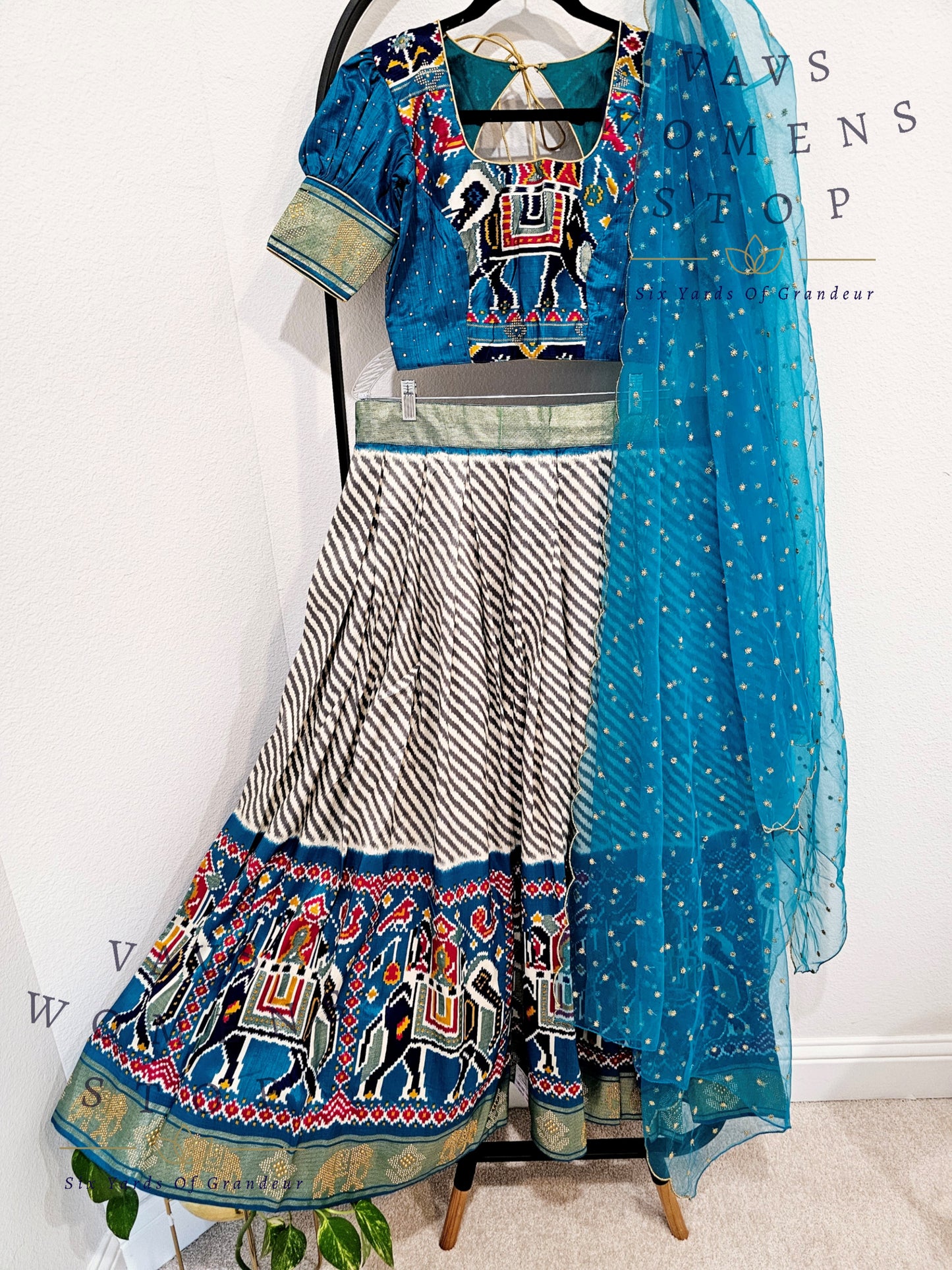 Elevate your ethnic wardrobe with this stunning Munga Benarasi Patola Half Saree/ Lehenga Set. Crafted with intricate details and rich fabrics, this set is perfect for any special occasion. The lehenga and blouse are made from luxurious Munga Patola fabric, while the dupatta is made from delicate net material. The blouse is available in size 34, expandable up to size 40, and alterations can be made for size 32 upon request. The sleeves are elbow length, and the blouse is unpadded for a comfortable fit. If you require lehenga measurements, please message us in advance before making your purchase.
