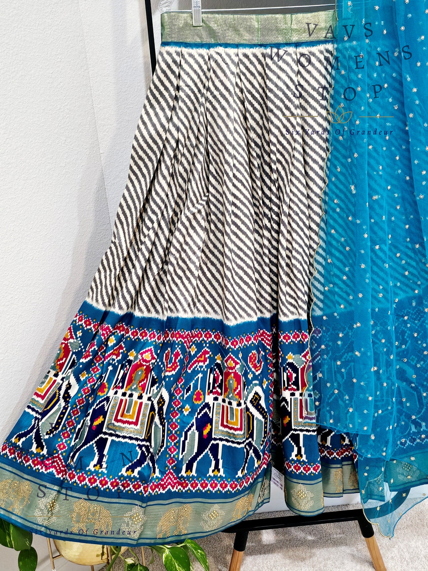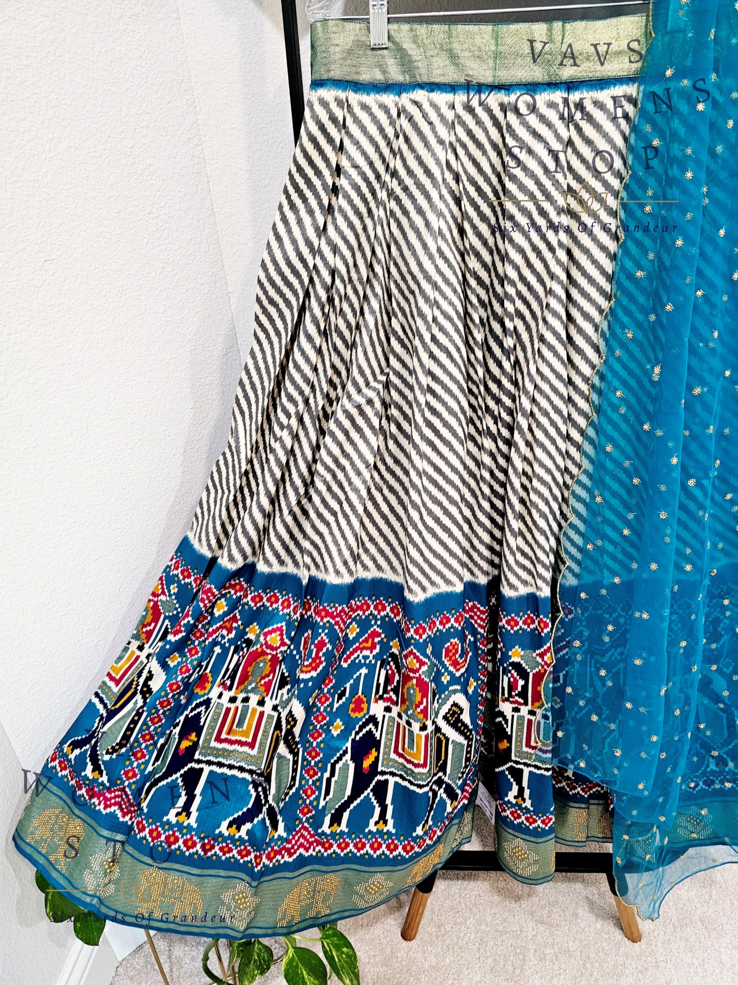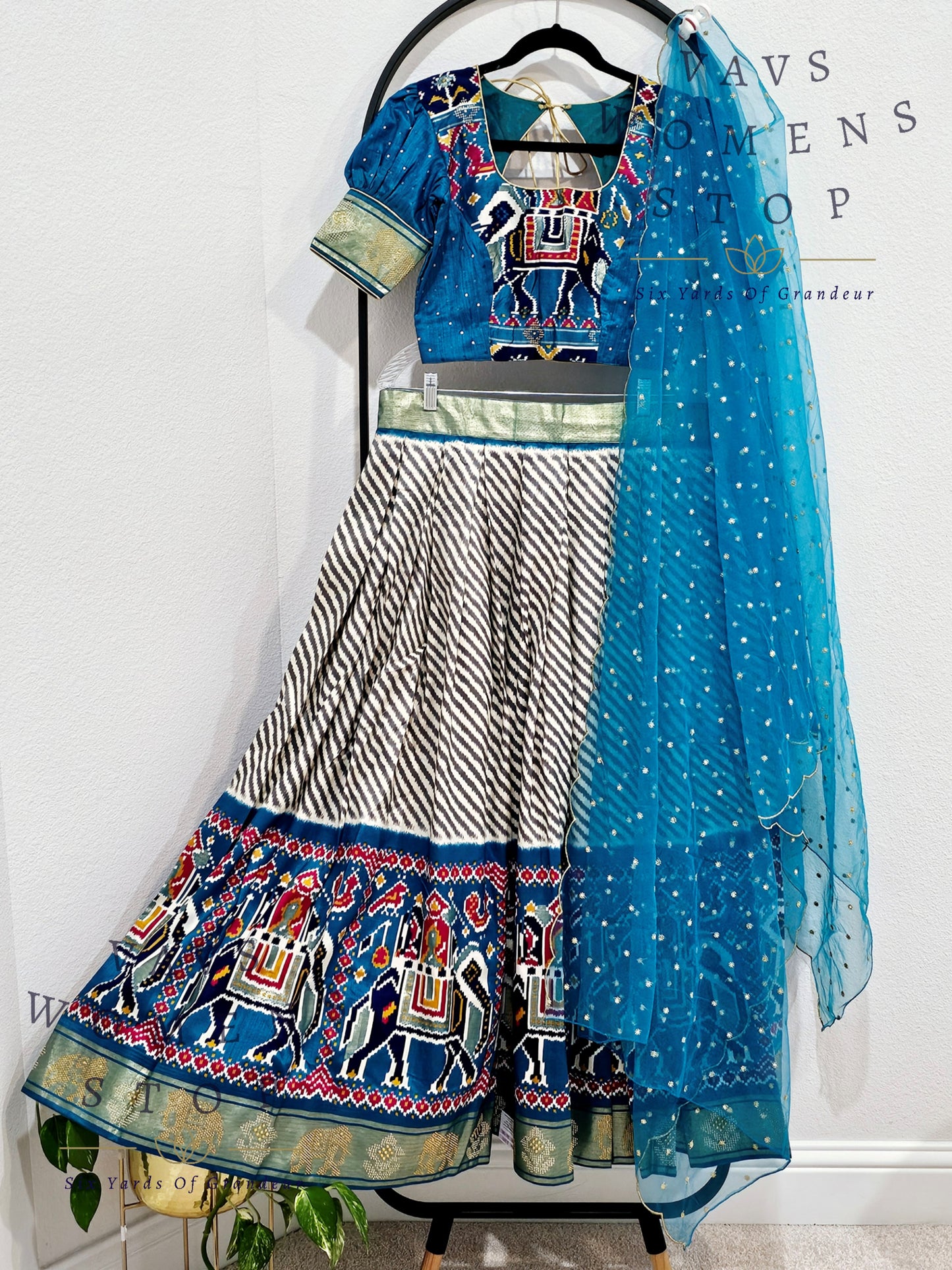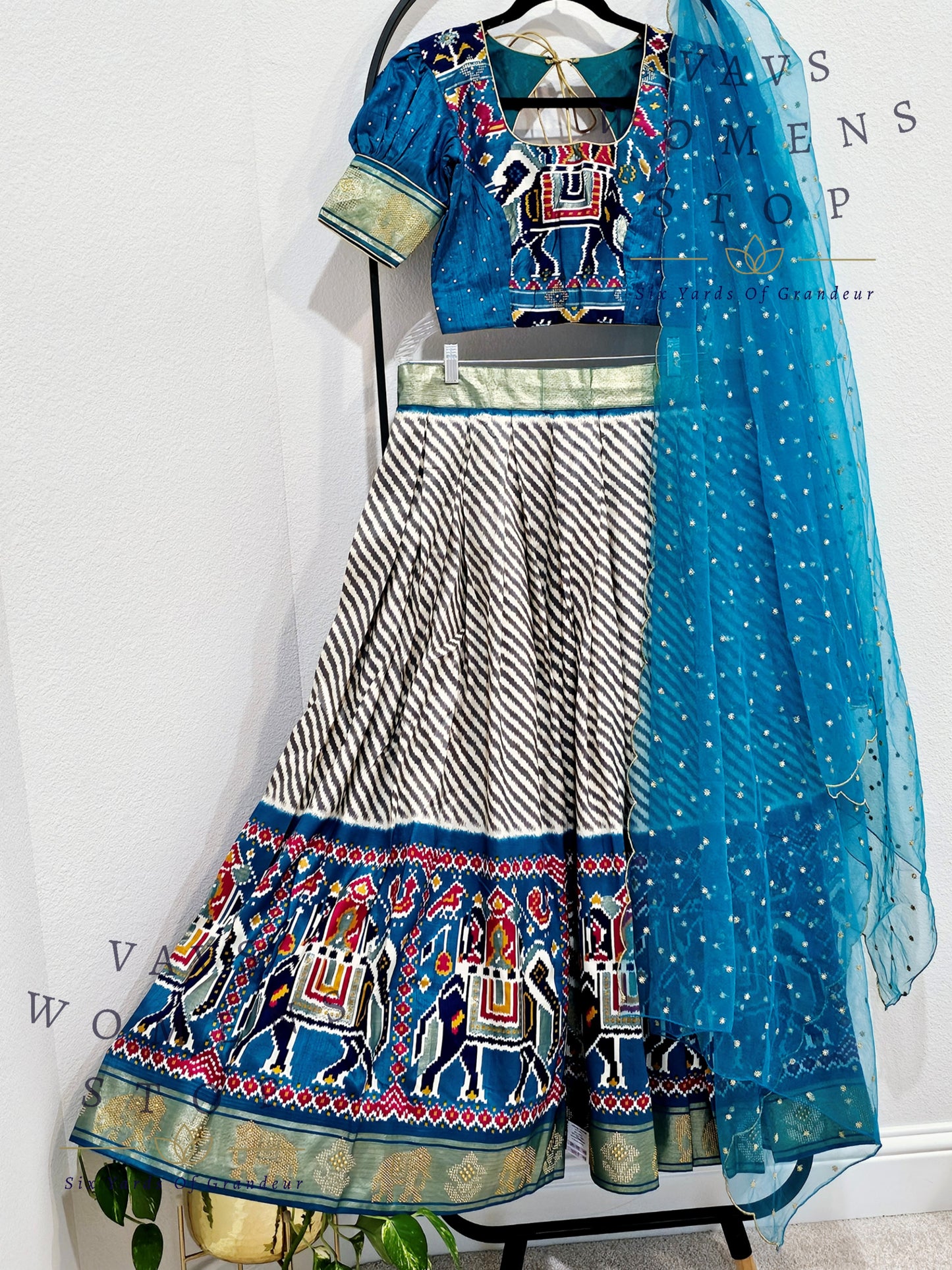 Elevate your ethnic wardrobe with this stunning Munga Benarasi Patola Half Saree/ Lehenga Set. Crafted with intricate details and rich fabrics, this set is perfect for any special occasion. The lehenga and blouse are made from luxurious Munga Patola fabric, while the dupatta is made from delicate net material. The blouse is available in size 34, expandable up to size 40, and alterations can be made for size 32 upon request. The sleeves are elbow length, and the blouse is unpadded for a comfortable fit. If you require lehenga measurements, please message us in advance before making your purchase.
