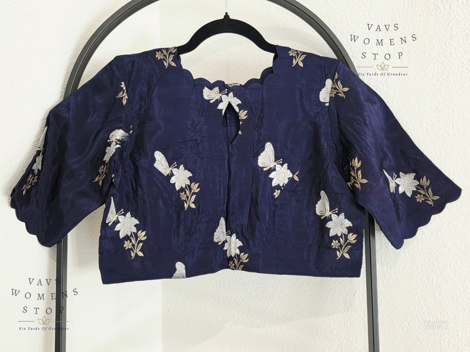Navy Blue Shade Munga Crepe Silk Butterfly Butta Stitched Blouse