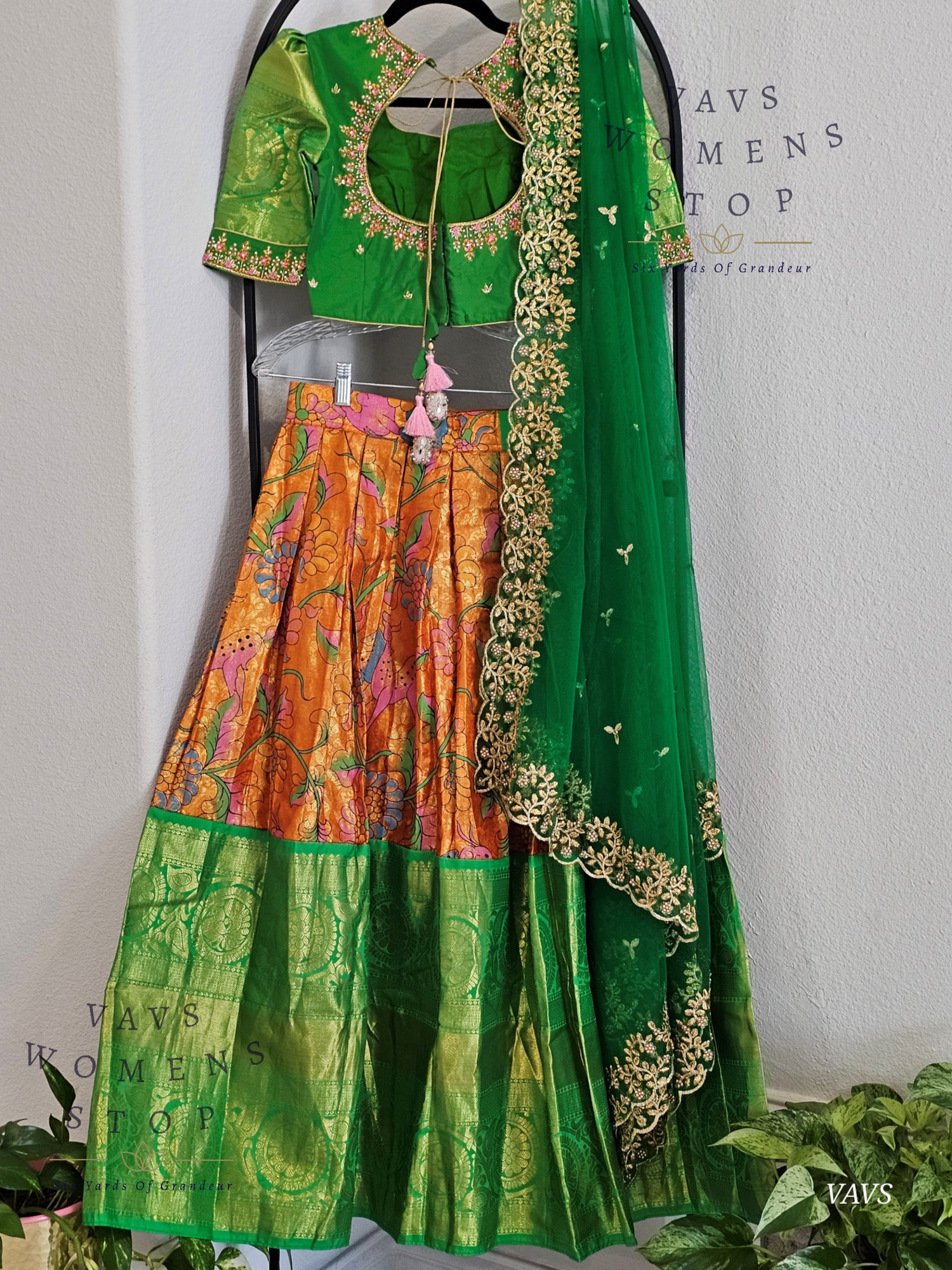 Bring home timeless elegance with this Orange Pure Kanchi Silk Kalamkari Print Half Saree Set, beautifully designed with a rich green border and matching dupatta. This traditional South Indian lehenga set is perfect for juniors to wear at weddings, cultural functions, and festive occasions.