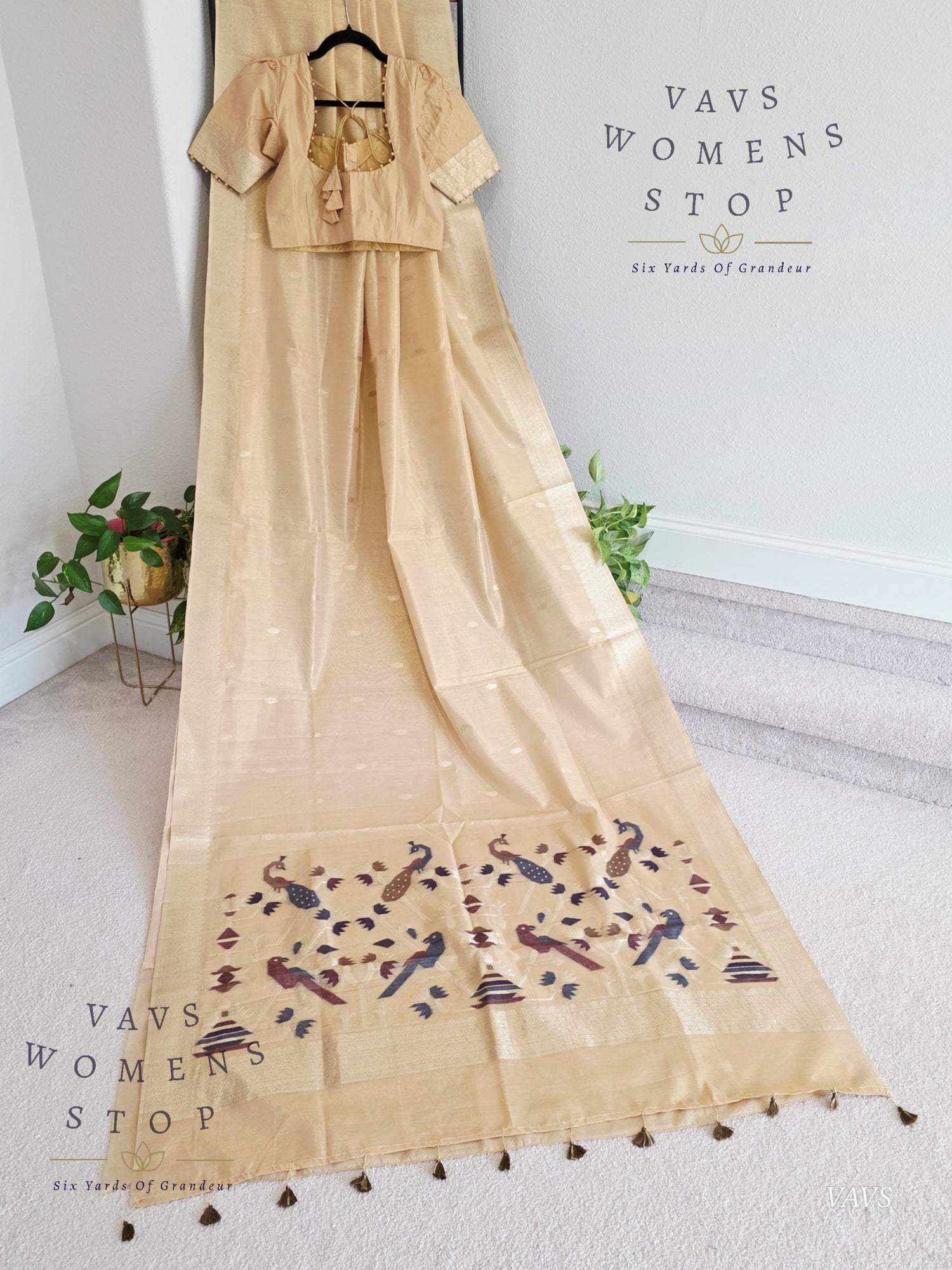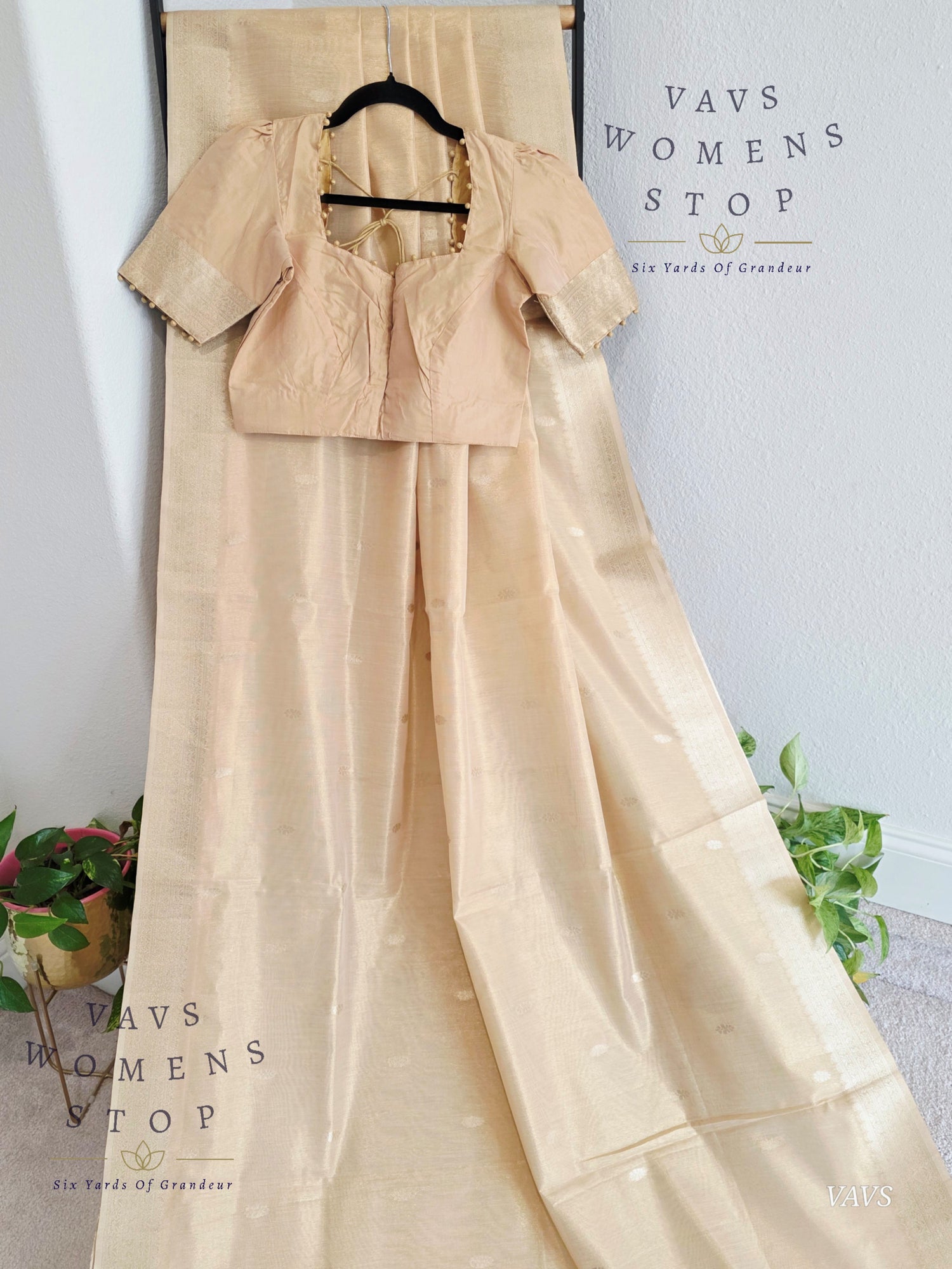 Pastel Light Brown Soft Tissue Saree with Jamdani Pallu & Stitched Blouse