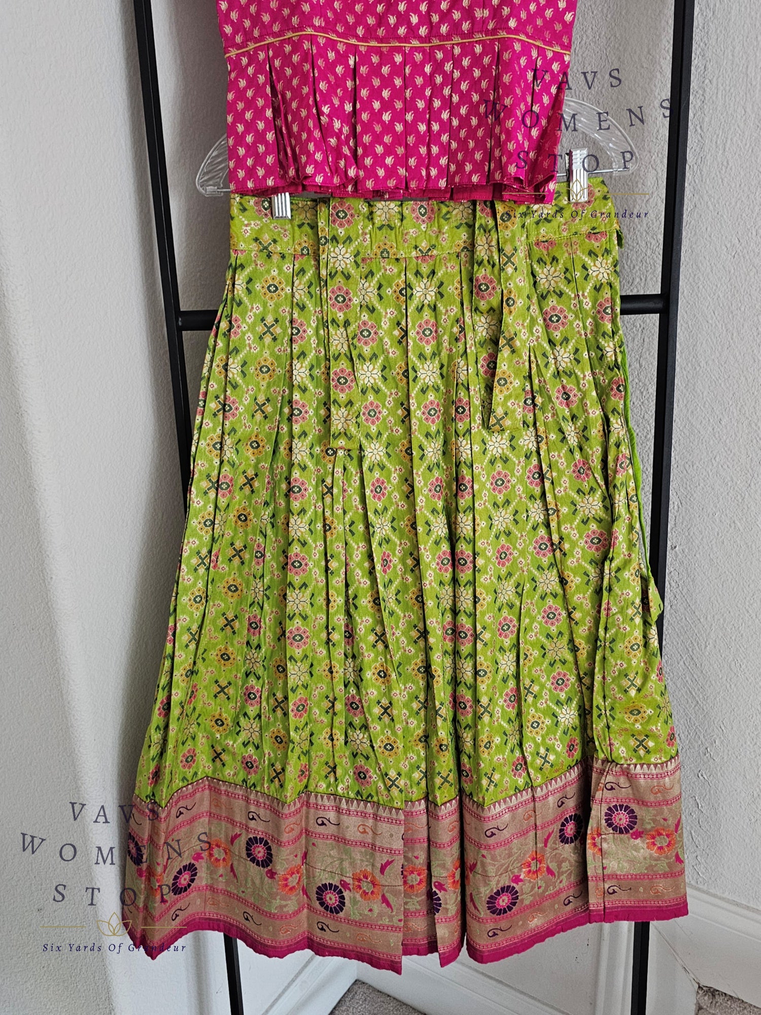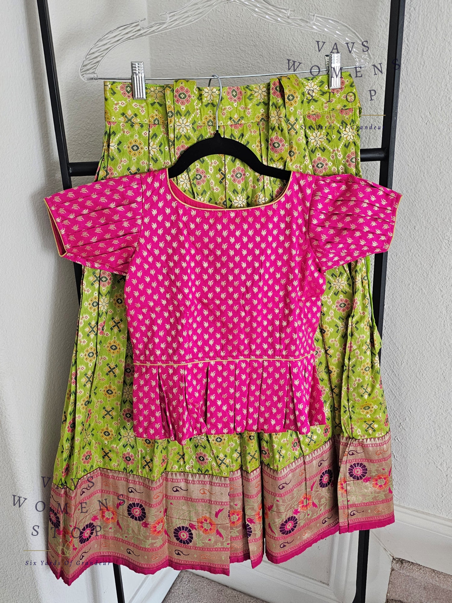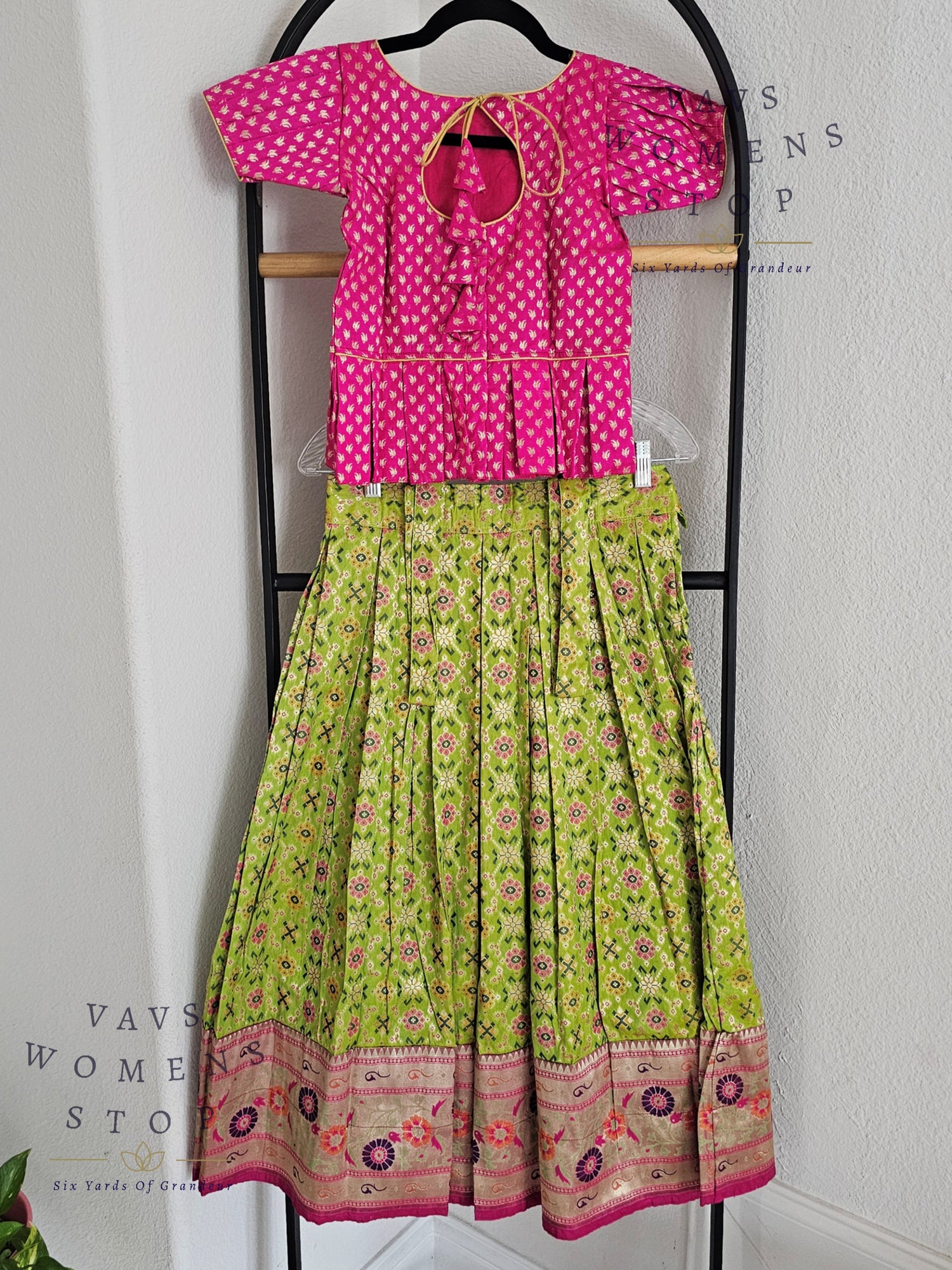 Patola Satin Benarasi with Paithani Border Kids Pattu Pavadai Langa Blouse Suits for 6 years to 7 years girls