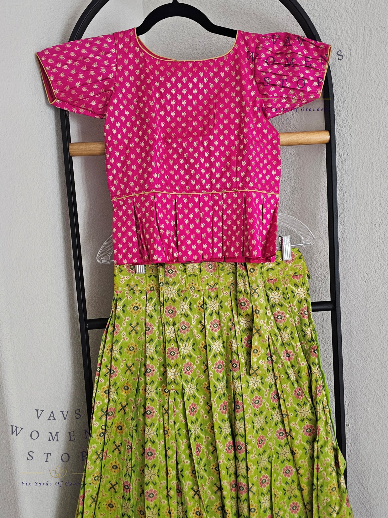 This traditional attire is perfect for young girls aged 6 to 7 years old. Made from soft and semi-benarasi fabric, this pattu pavada/ langa blouse/ lehenga crop top is tailored to perfection. The cute and ethnic design adds a touch of auspiciousness to any occasion. The lehenga length and blouse width can be easily adjusted to fit your child's growing body, ensuring that they can wear it for years to come.