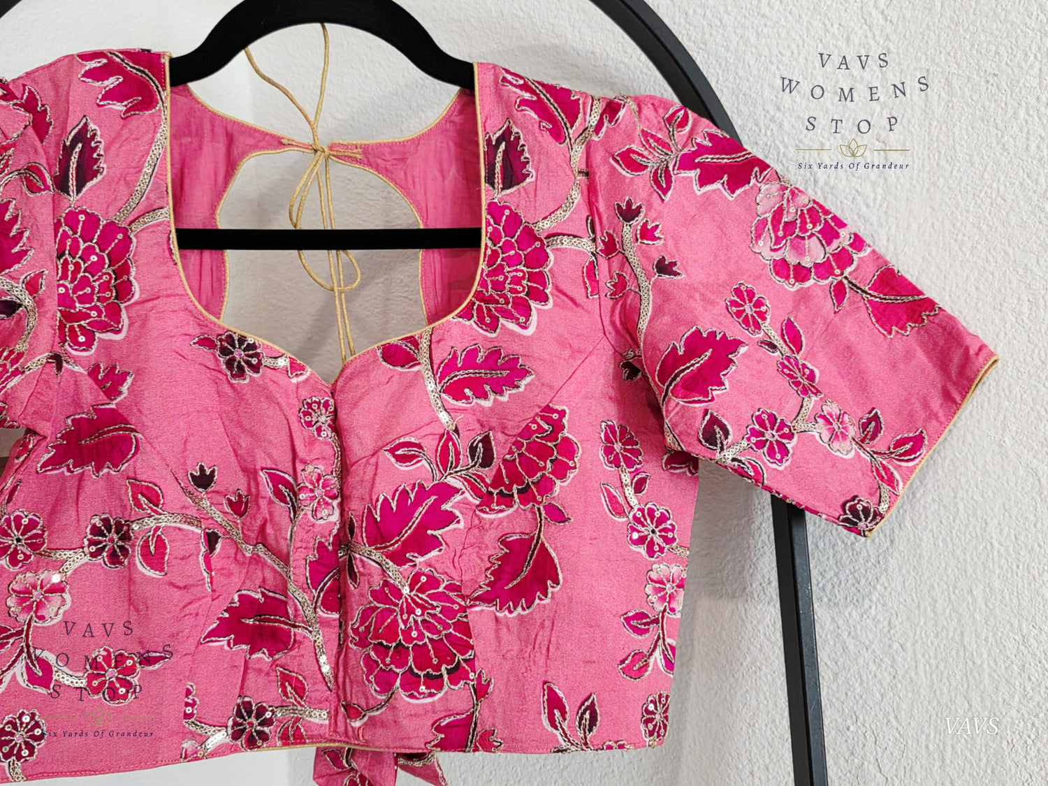 Add a touch of timeless elegance to your wardrobe with this Pink Shade Soft Tussar Silk Floral Embroidered Stitched Blouse. Beautifully crafted with outline machine embroidery and delicate sequin work, this blouse blends sophistication with festive charm — perfect for special occasions and celebrations.