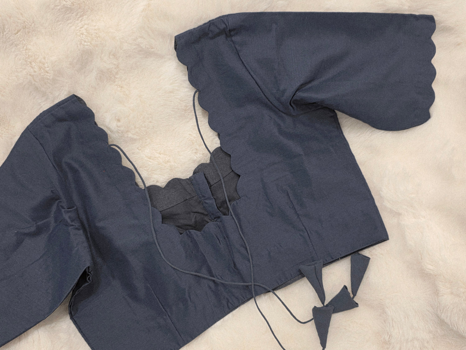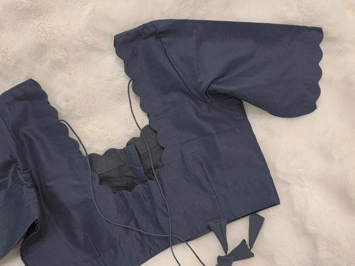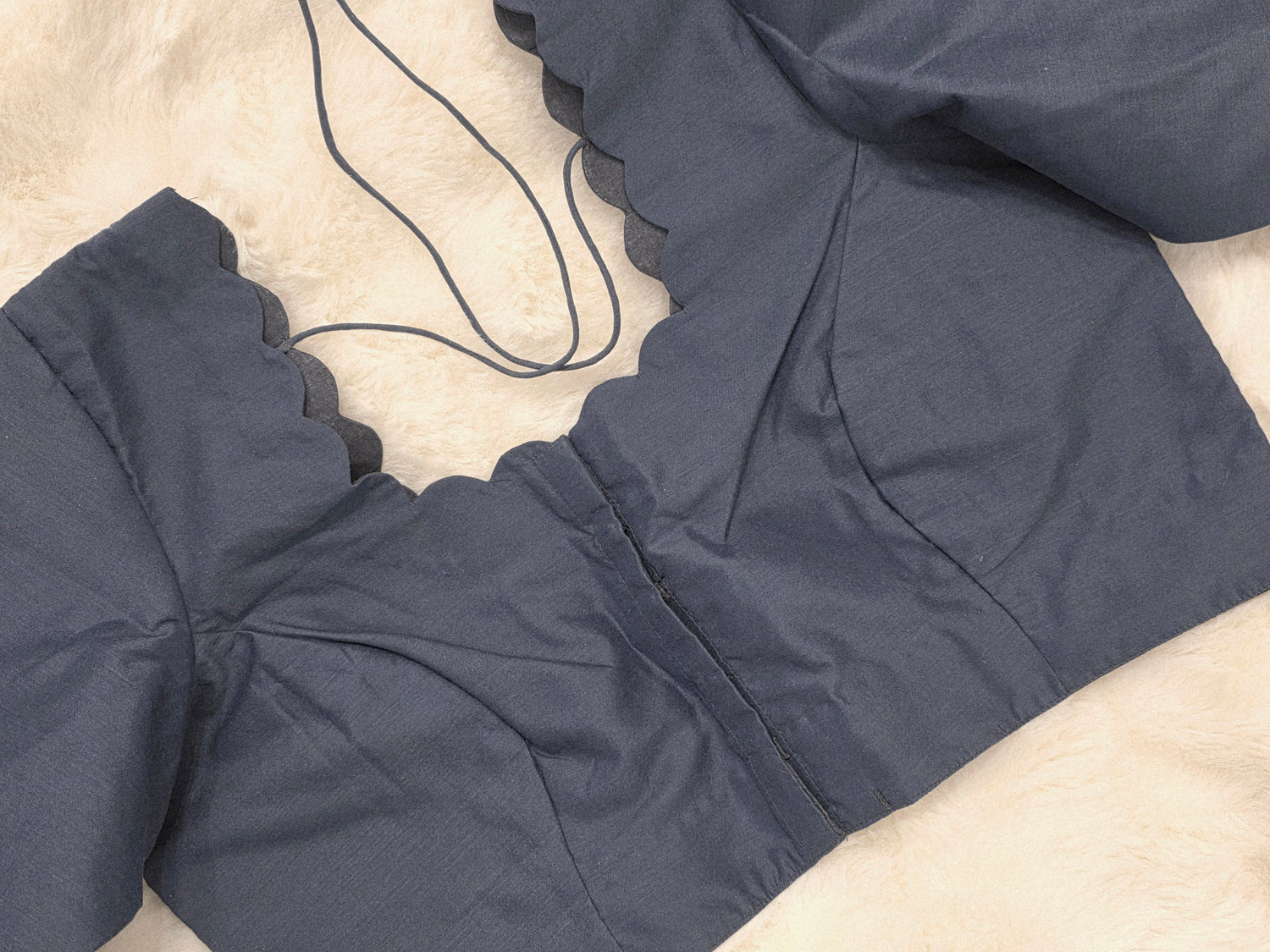 The blouse is styled with elbow-length sleeves finished with scalloped edges and a graceful scalloped sweetheart neckline, adding subtle sophistication to its plain design. With a front opening and inner margins for size extension, it offers both ease of wear and flexible fitting. The non-padded structure ensures all-day comfort.