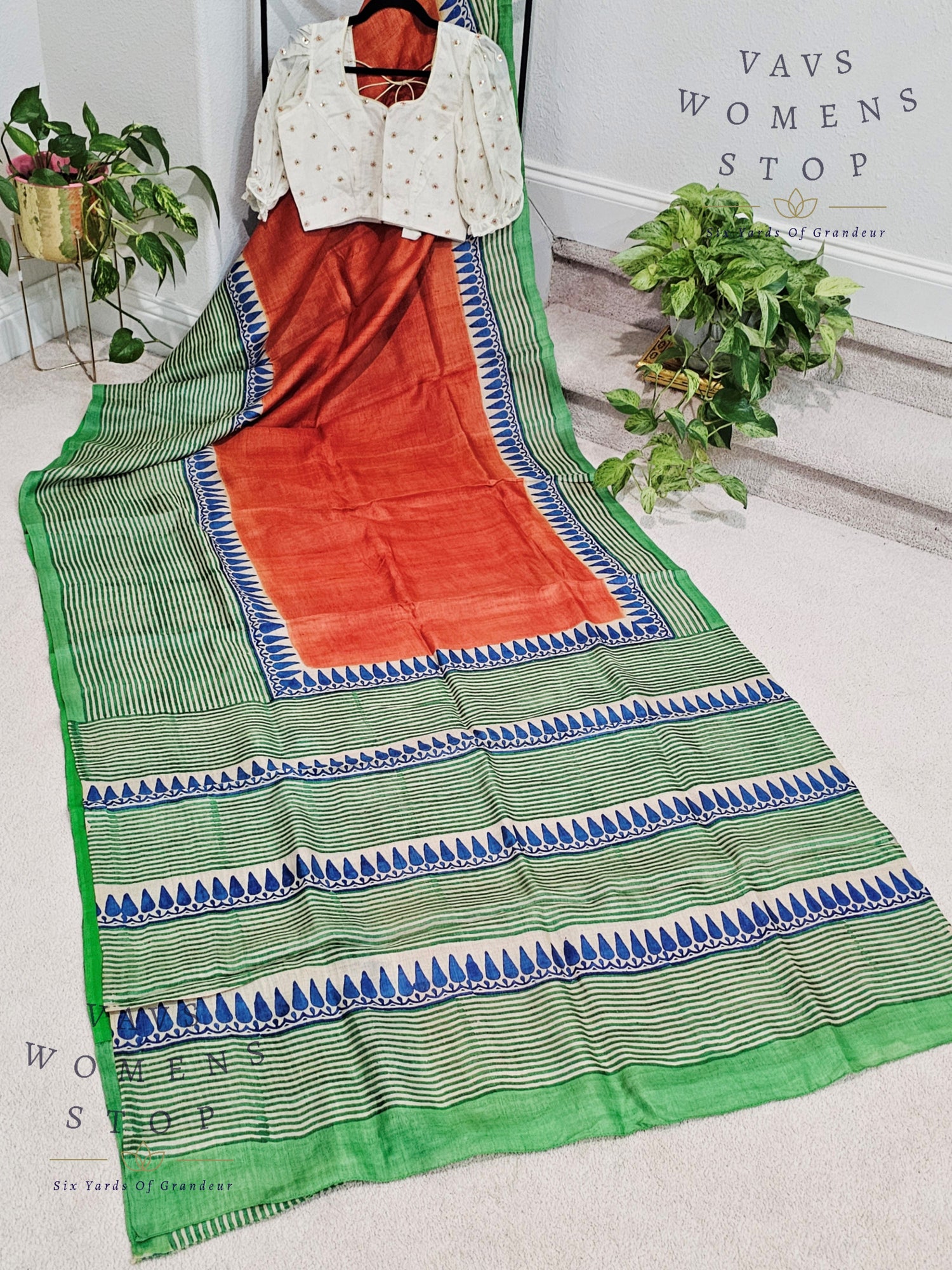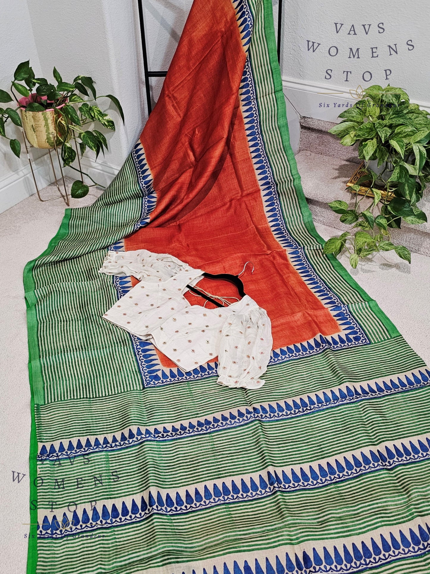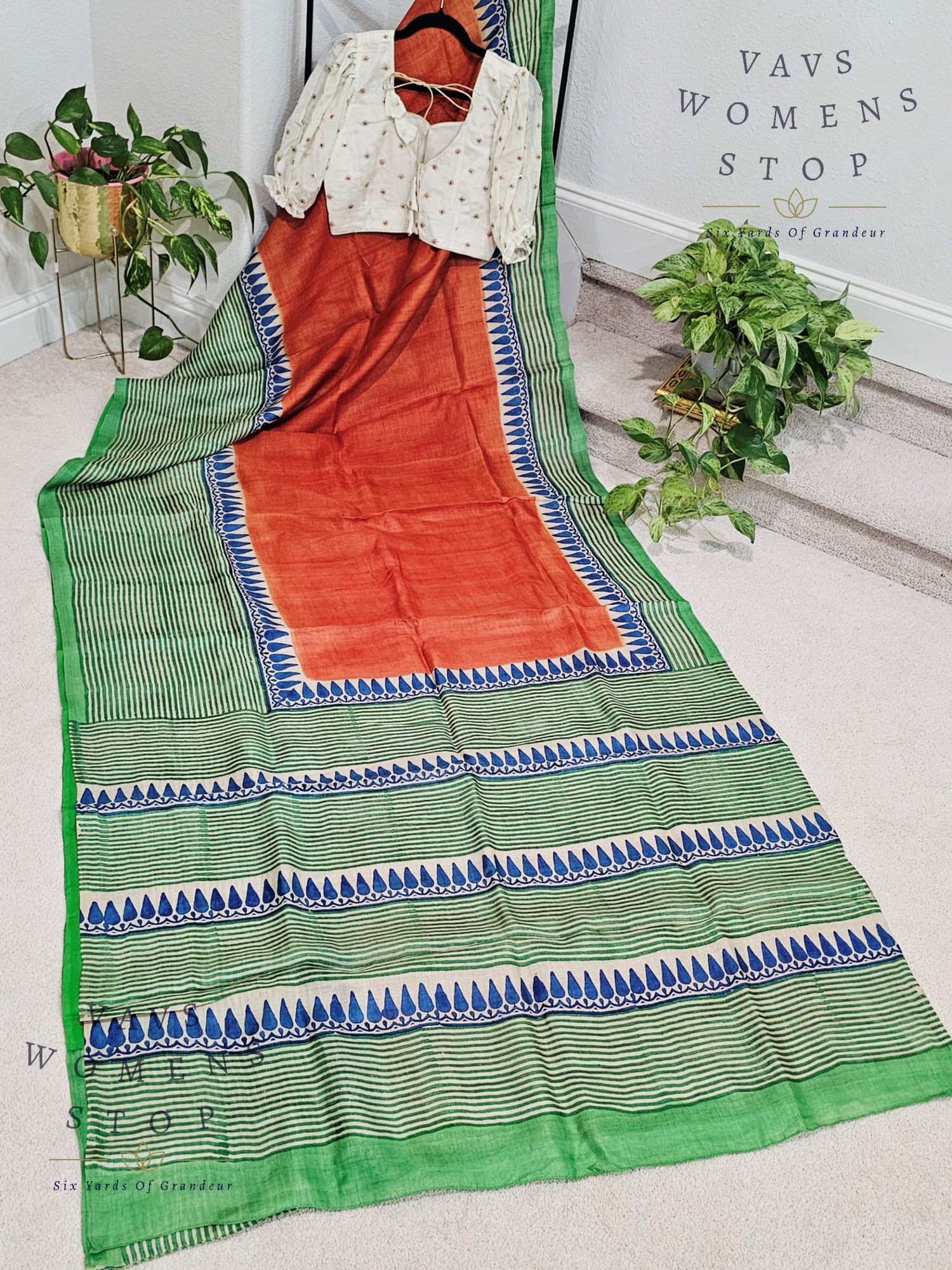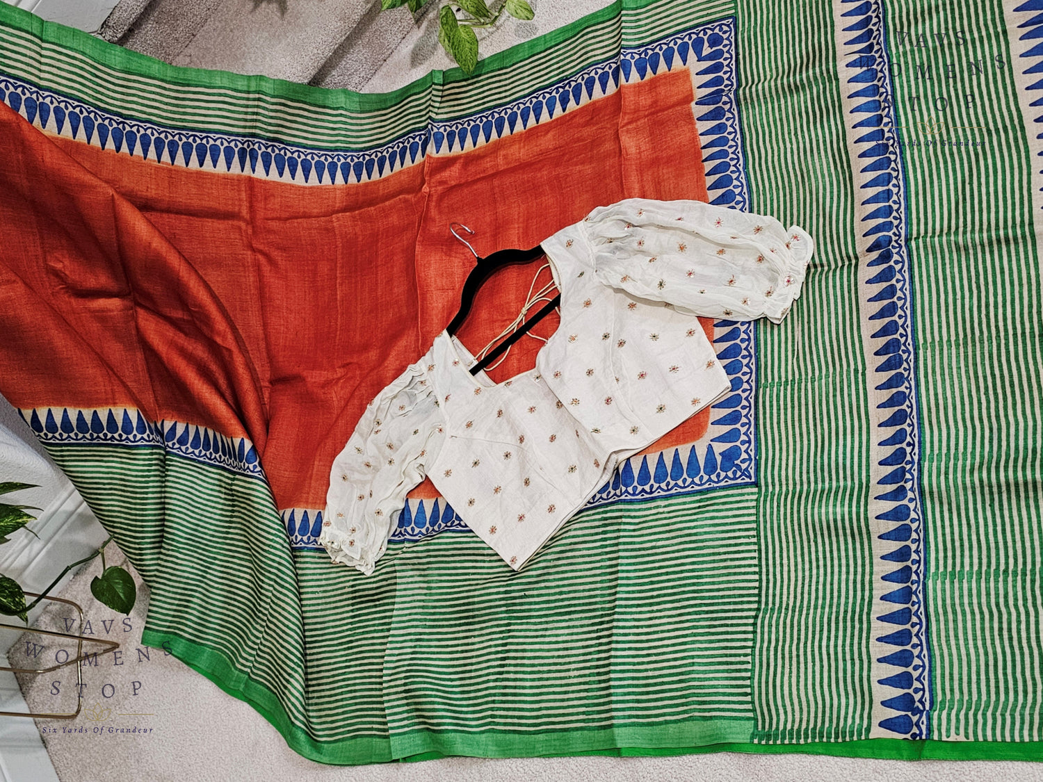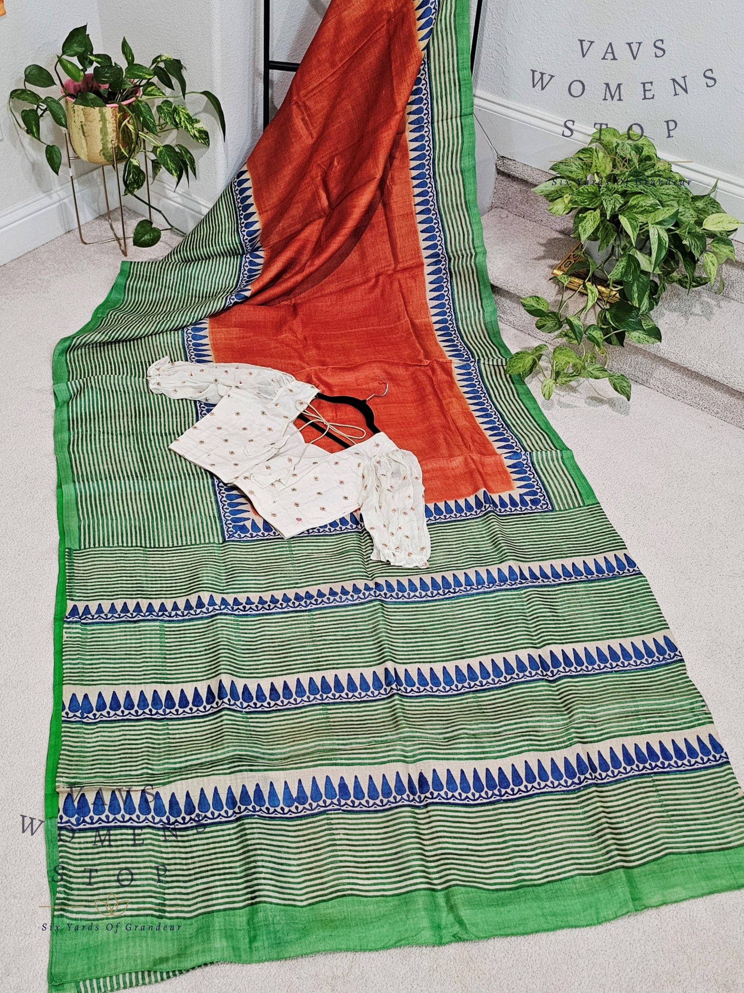 Pure Tussar Handblock Print Saree - Chinon Chiffon Designer Blouse