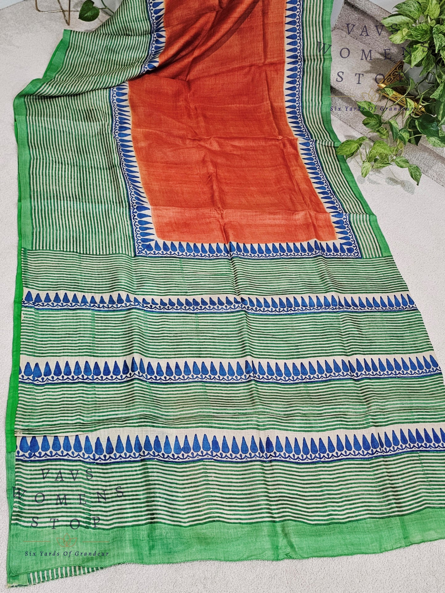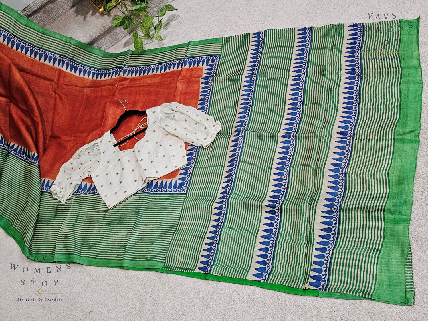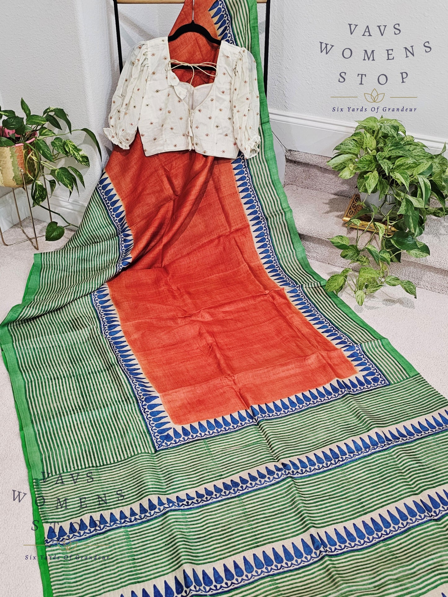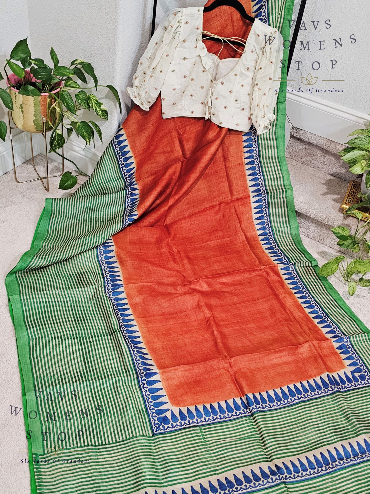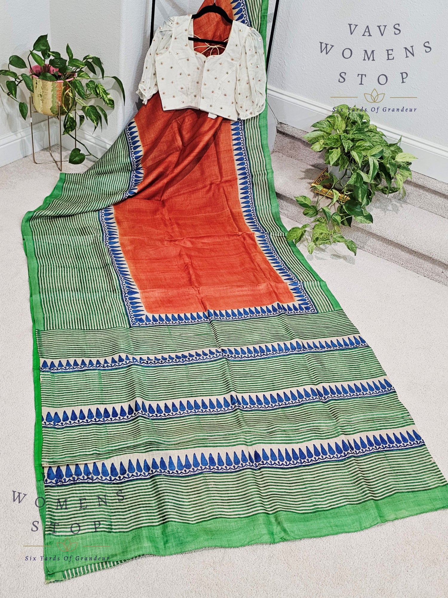 Pure Tussar Handblock Print Saree - Chinon Chiffon Designer Blouse