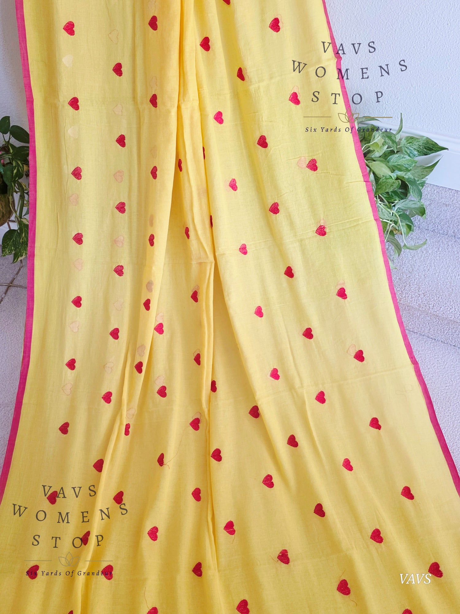 Soft Mul Yellow Cotton Saree with Heart Buta Embroidery & Red Georgette Blouse