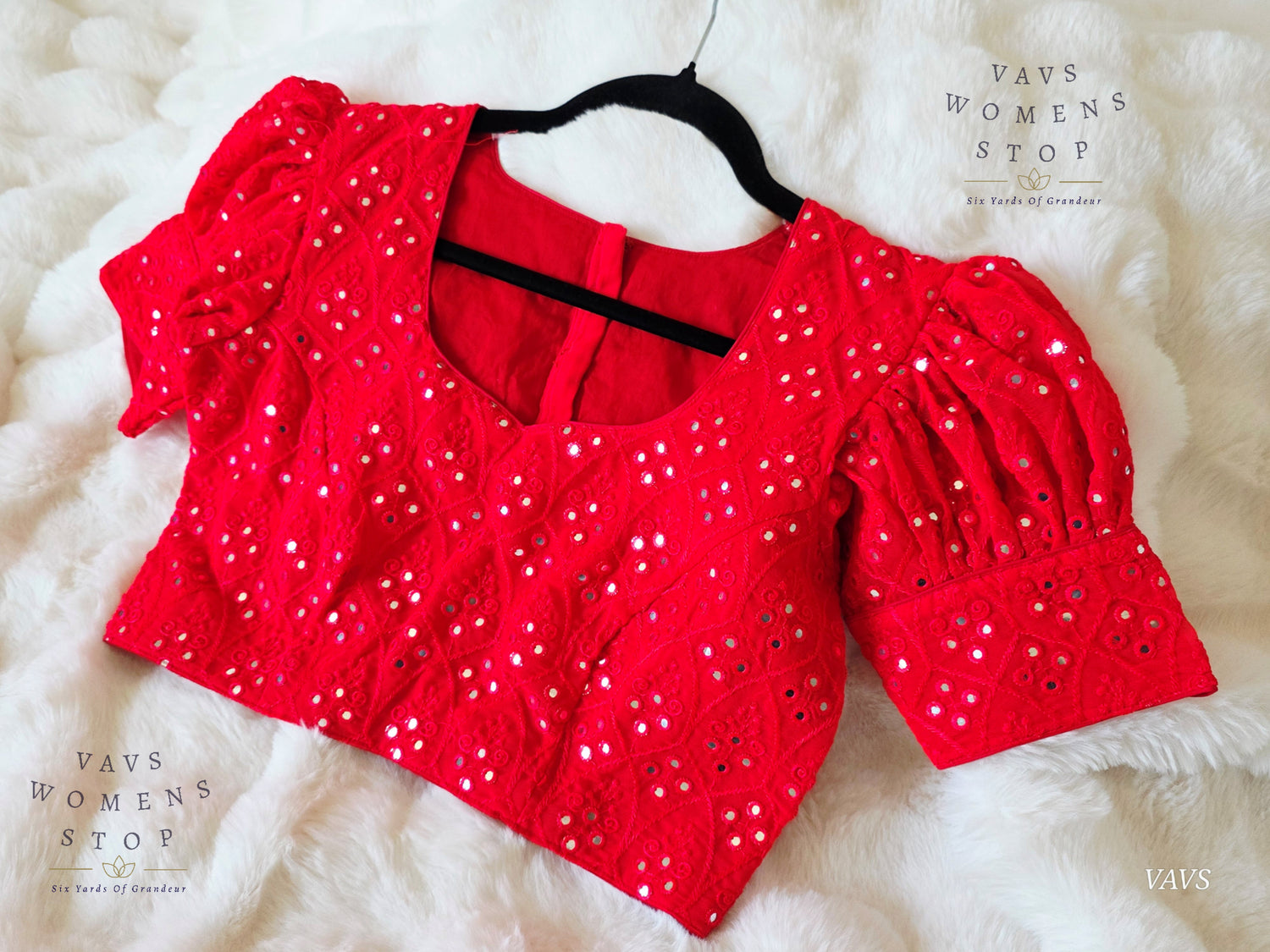 The blouse comes in size 38 and extends up to 44, offering a flexible and comfortable fit. back-opening blouse, non-padded, and premium quality tailored finish.