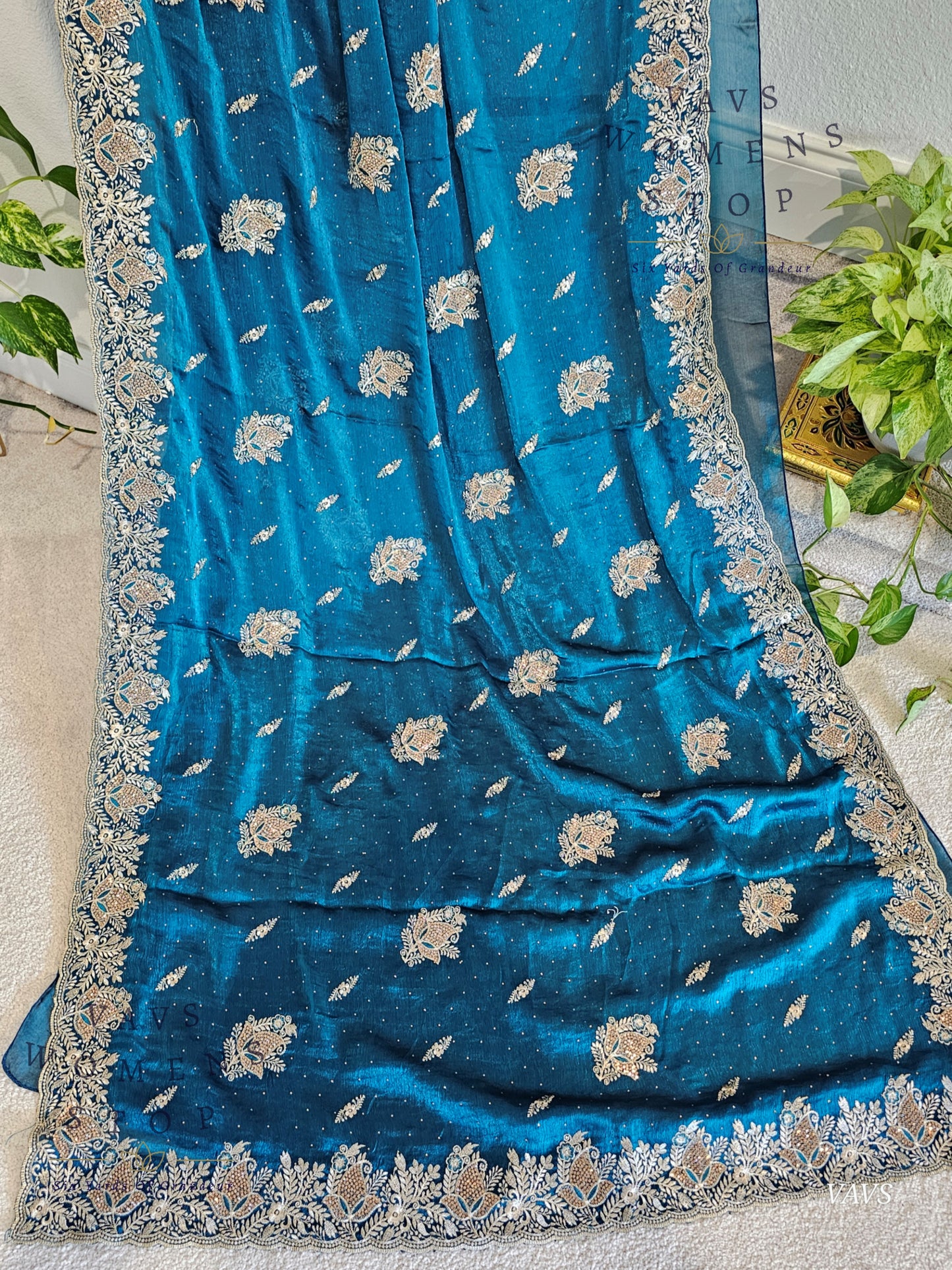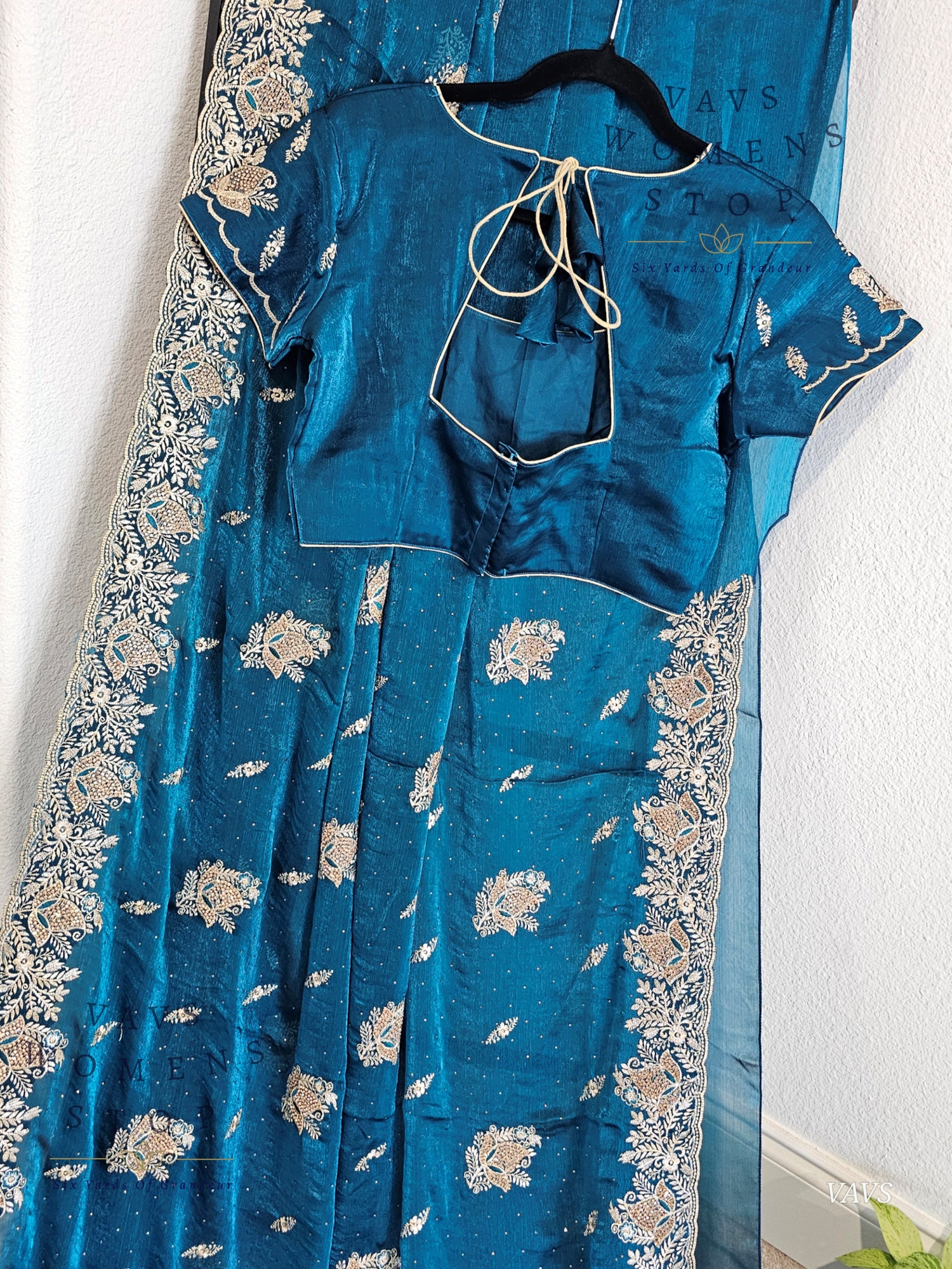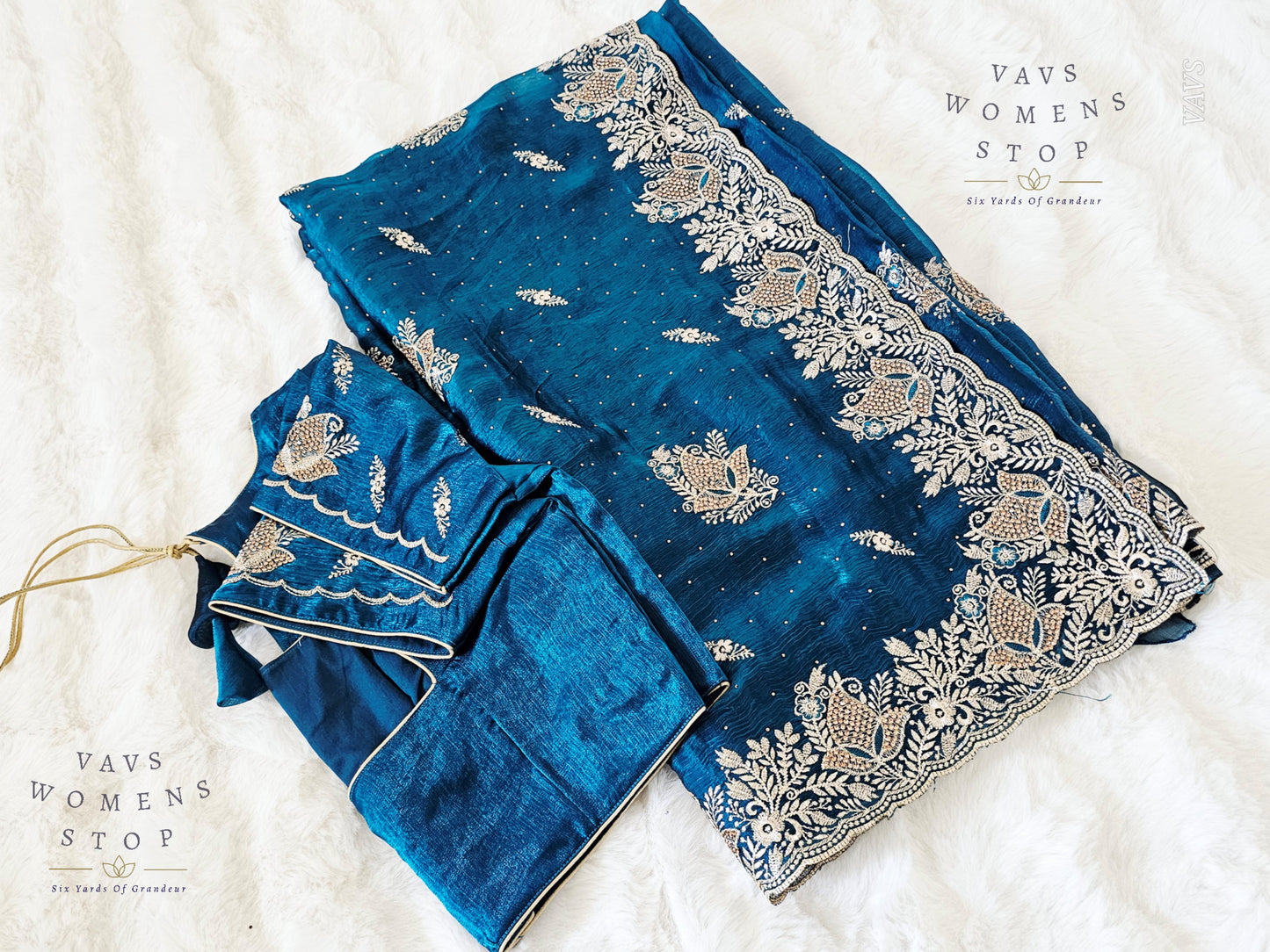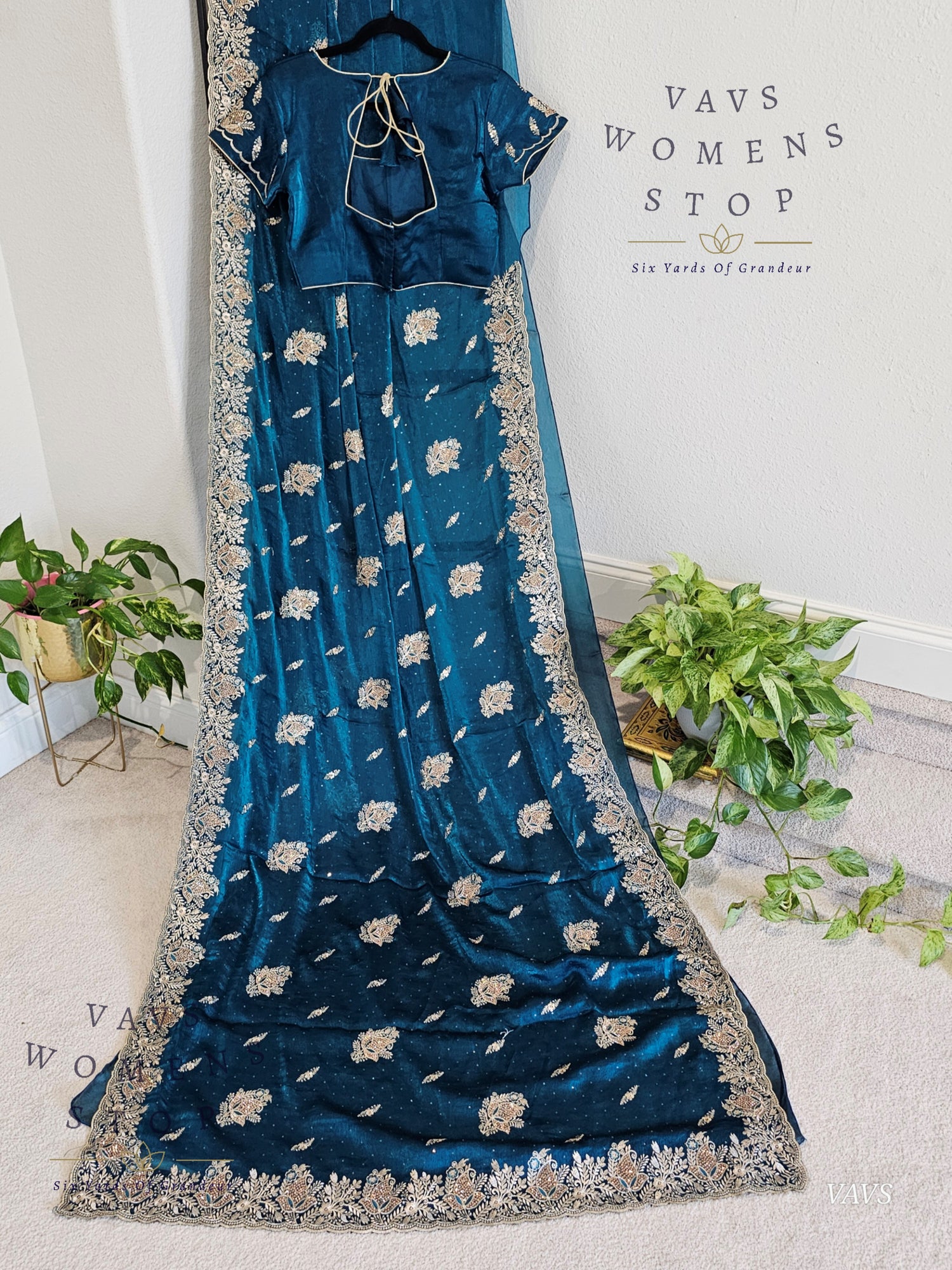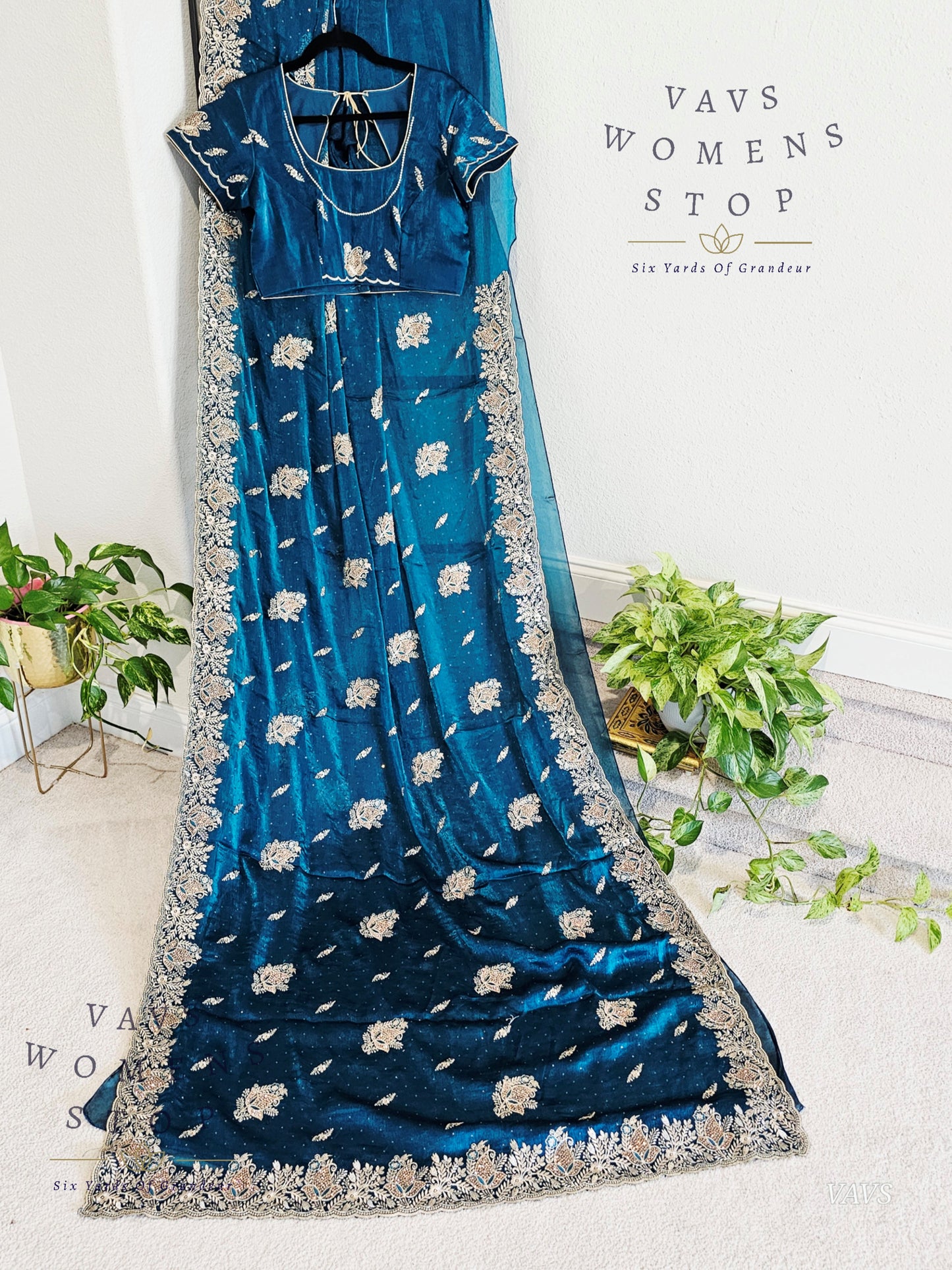 Shimmer and shine in this chic Space Silk Sheen Saree, designed to turn heads at any cocktail party or evening event. Crafted from lightweight silk sheen fabric, this saree offers a stunning flow with a soft, glossy finish. Paired with a designer blouse, it strikes the perfect balance between sophistication and modern glam.