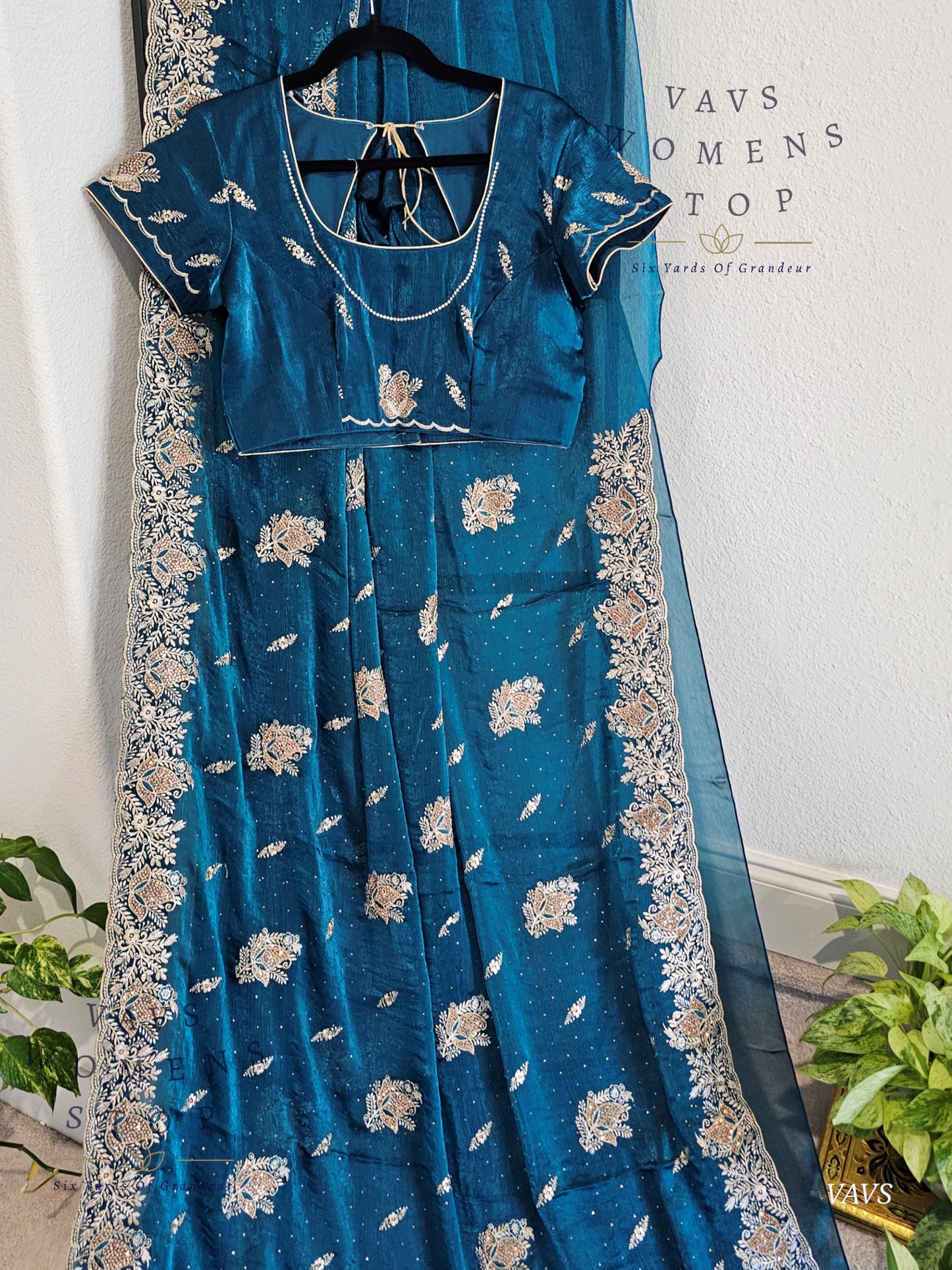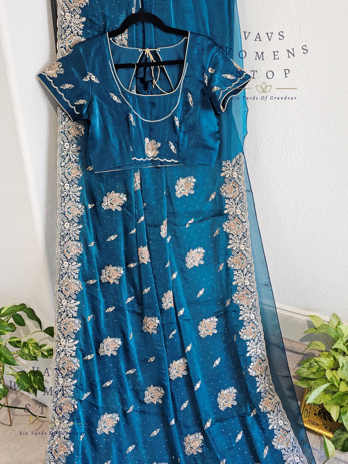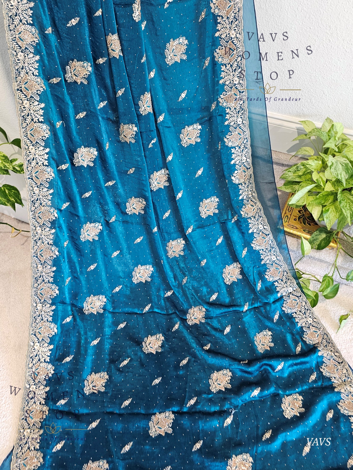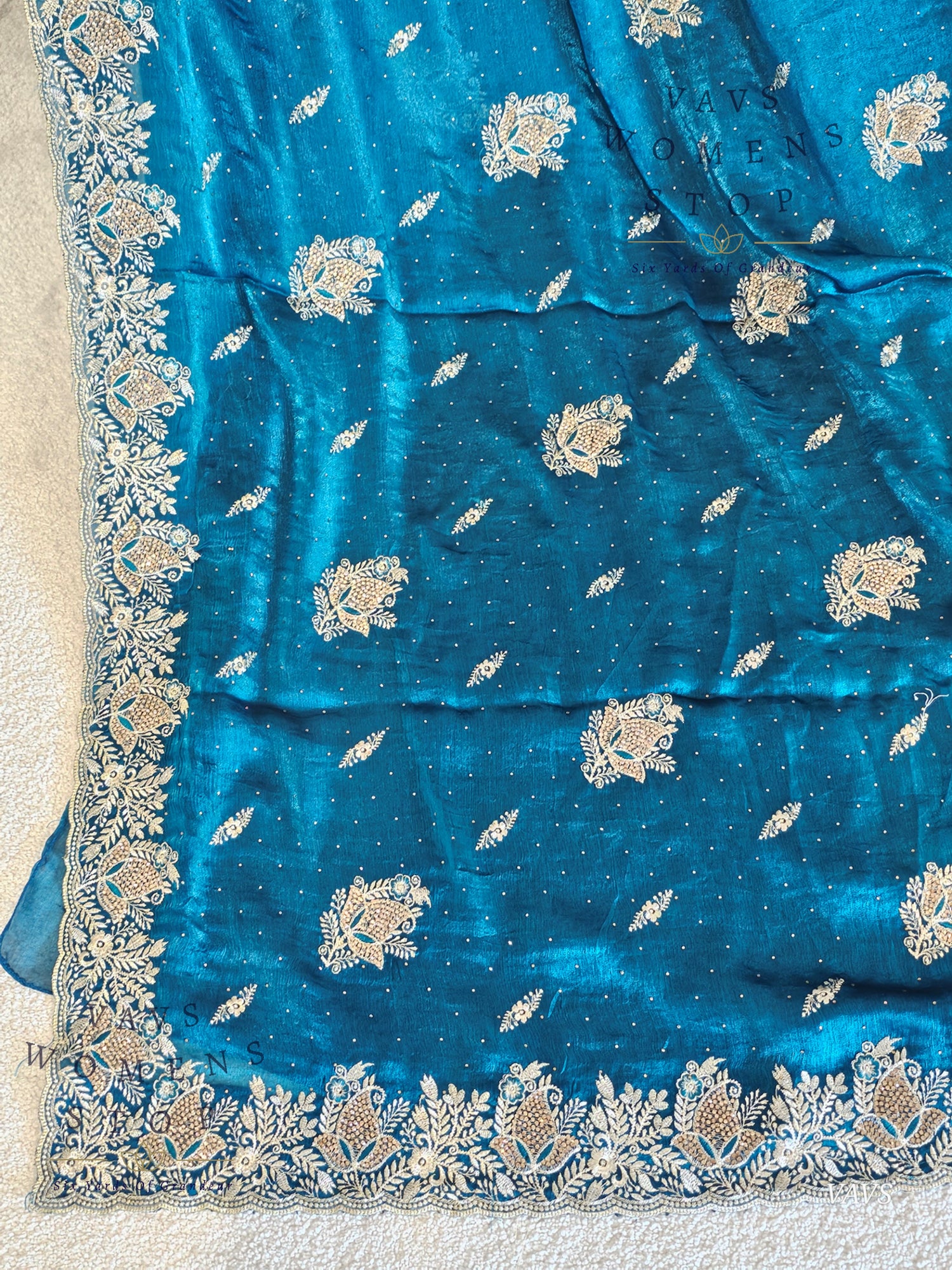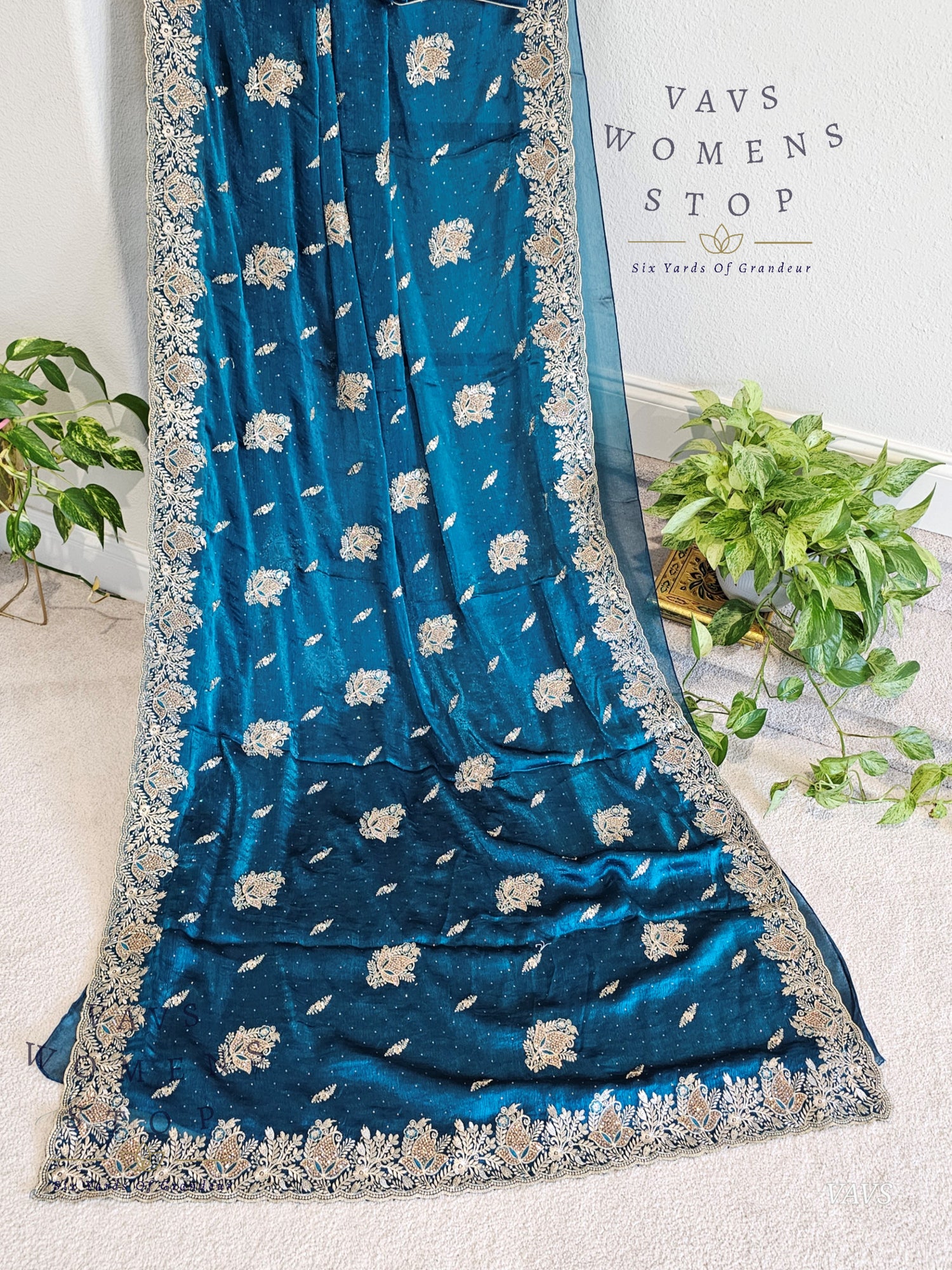 Shimmer and shine in this chic Space Silk Sheen Saree, designed to turn heads at any cocktail party or evening event. Crafted from lightweight silk sheen fabric, this saree offers a stunning flow with a soft, glossy finish. Paired with a designer blouse, it strikes the perfect balance between sophistication and modern glam.